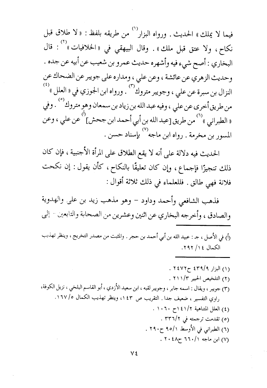 فيما لا يملك" الحديث. ورواه البزار (¬1) من طريقه بلفظ: "لا طلاق قبل نكاح، ولا عتق قبل ملك". وقال البيهقي في "الخلافيات" (¬2): قال البخاري: أصح شيء فيه وأشهره حديث عمرو بن شعيب عن أبيه عن جده. وحديث الزهري عن عائشة، وعن علي، ومداره على جويبر عن الضحاك في النزال بن سبرة عن علي، وجويبر متروك (¬3). ورواه ابن الجوزي في "العلل" (¬4) من طريق أخرى عن علي، وفيه عبد الله بن زياد بن سمعان وهو متروك (¬5). وفي "الطبراني" (¬6) من طريق [عبد الله بن أبي أحمد بن جحش] (أ) عن علي، وعن المسور بن مخرمة. رواه ابن ماجه (¬7) بإسناد حسن.