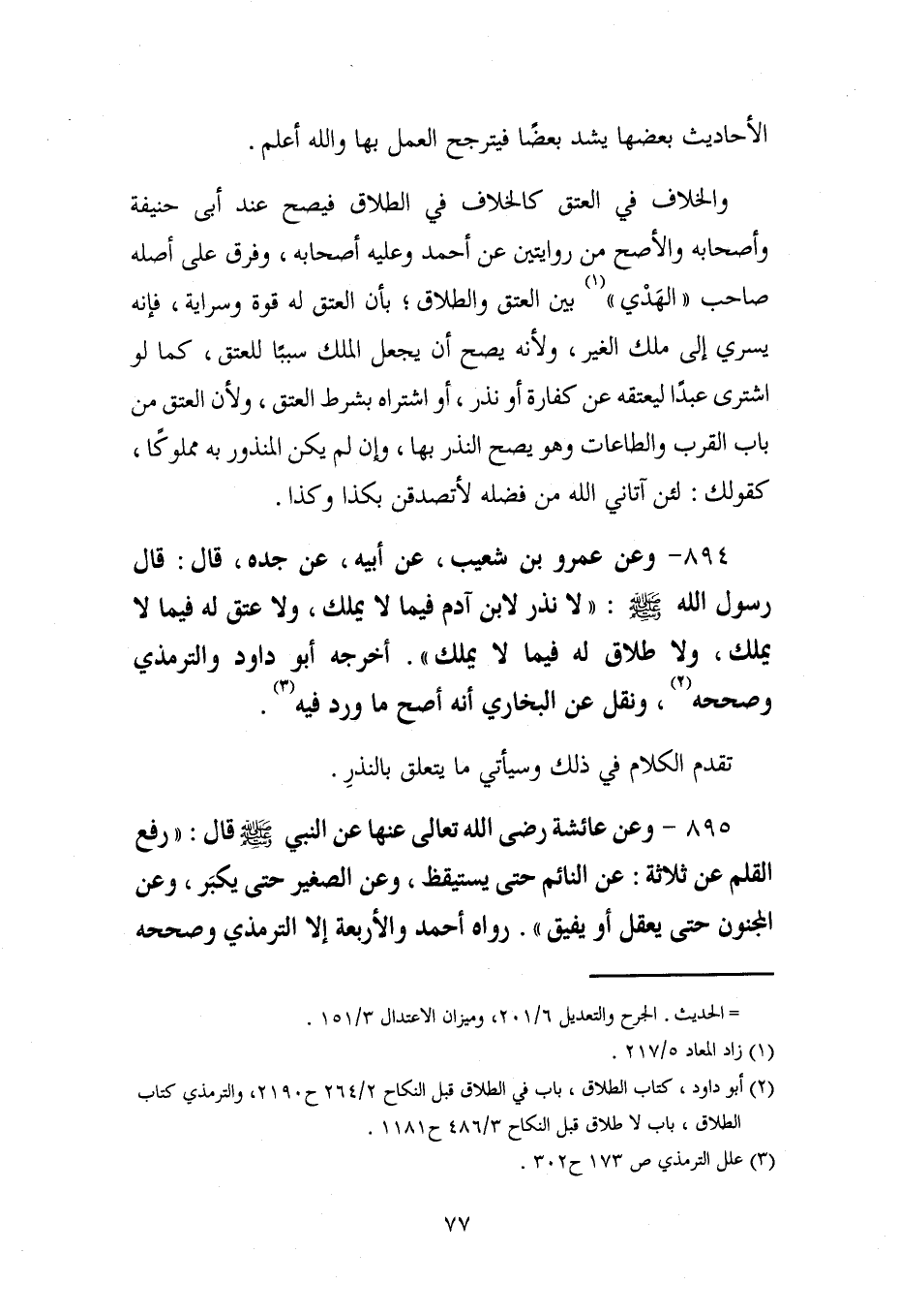 895 - وعن عائشة رضي الله تعالى عنها عن النبي - صلى الله عليه وسلم - قال: "رفع القلم عن ثلاثة: عن النائم حتى يستيقظ، وعن الصغير حتى يكبَر، وعن المجنون حتى يعقل أو يفيق". رواه أحمد والأربعة إلا الترمذي وصححه