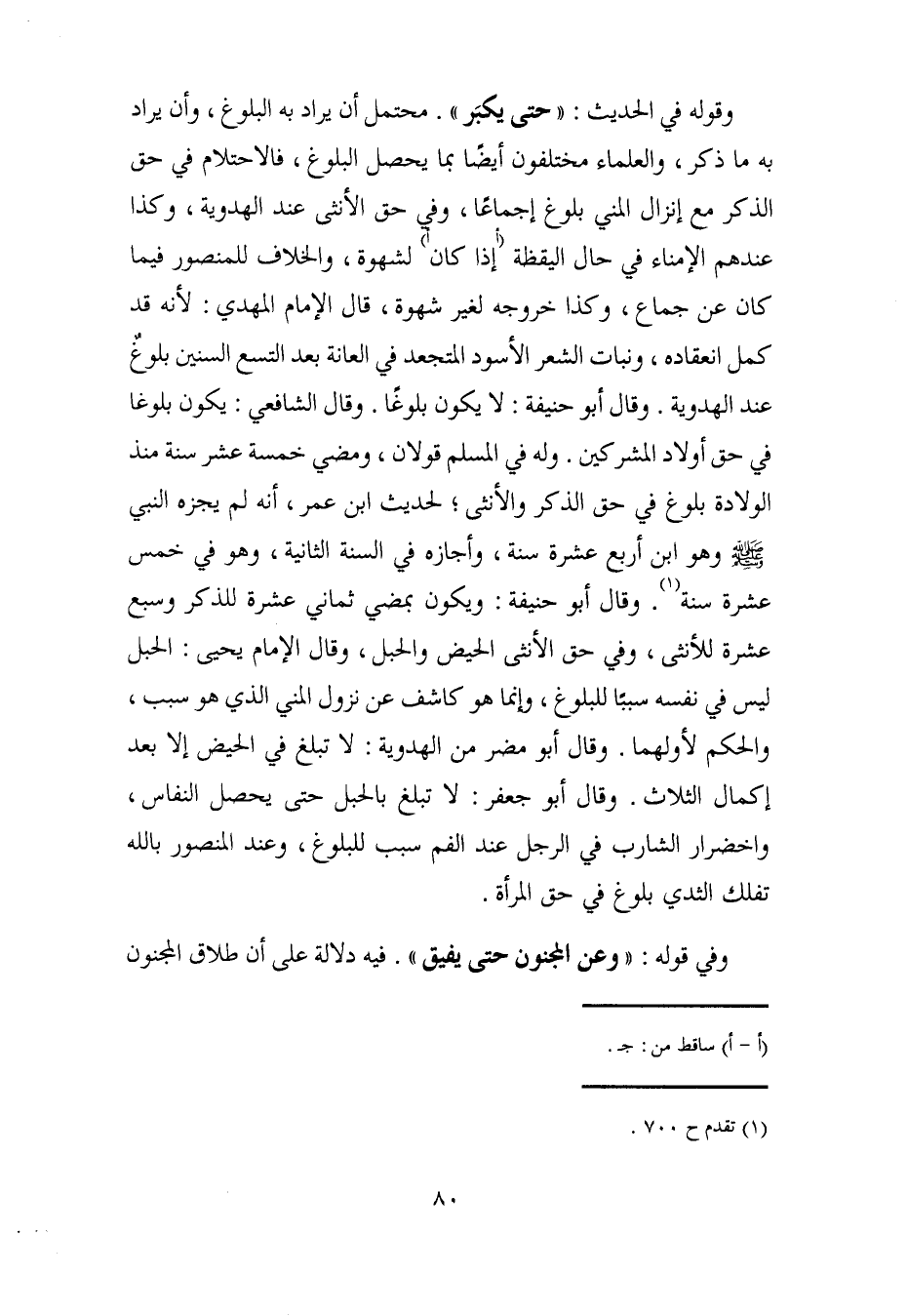 وقوله في الحديث: "حتى يكبَر". محتمل أن يراد به البلوغ، وأن يراد به ما ذكر، والعلماء مختلفون أيضًا بما يحصل البلوغ، فالاحتلام في حق الذكر مع إنزال النبي بلوغ إجماعًا، وفي حق الأنثى عند الهدوية، وكذا عندهم الإمناء في حال اليقظة (أإذا كان أ) لشهوة، والخلاف للمنصور فيما كان عن جماع، وكذا خروجه لغير شهوة، قال الإمام المهدي: لأنه قد كمل انعقاده، ونبات الشعر الأسود المتجعد في العانة بعد التسع السنين بلوغٌ عند الهدوية. وقال أبو حنيفة: لا يكون بلوغًا. وقال الشافعي: يكون بلوغا في حق أولاد المشركين. وله في المسلم قولان، ومضي خمسة عشر سنة منذ الولادة بلوغ في حق الذكر والأنثى؛ لحديث ابن عمر، أنه لم يجزه النبي - صلى الله عليه وسلم - وهو ابن أربع عشرة سنة، وأجازه في السنة الثانية، وهو في خمس عشرة سنة (¬1). وقال أبو حنيفة: ويكون بمضي ثماني عشرة للذكر وسبع عشرة للأنثى، وفي حق الأنثى الحيض والحبل، وقال الإمام يحيى: الحبل ليس في نفسه سببًا للبلوغ، وإنما هو كاشف عن نزول المني الذي هو سبب، والحكم لأولهما. وقال أبو مضر من الهدوية: لا تبلغ في الحيض إلا بعد إكمال الثلاث. وقال أبو جعفر: لا تبلغ بالحبل حتى يحصل النفاس، واخضرار الشارب في الرجل عند الفم سبب للبلوغ، وعند المنصور بالله تفلك الثدي بلوغ في حق المرأة.