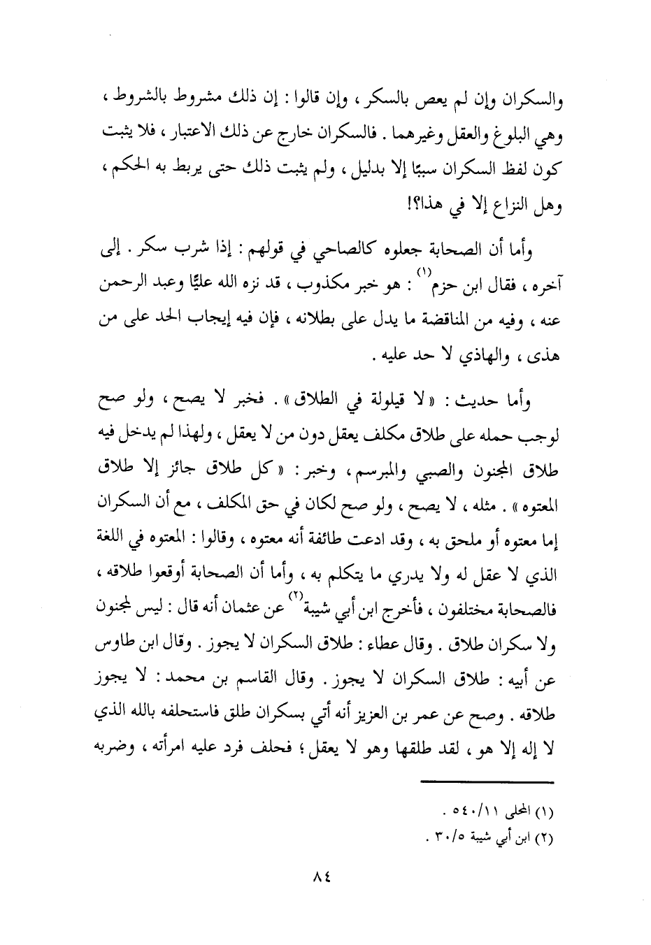 وأما حديث: "لا قيلولة في الطلاق". فخبر لا يصح، ولو صح لوجب حمله على طلاق مكلف يعقل دون من لا يعقل، ولهذا لم يدخل فيه طلاق المجنون والصبي والمبرسم، وخبر: "كل طلاق جائز إلا طلاق المعتوه". مثله، لا يصح، ولو صح لكان في حق المكلف، مع أن السكران إما معتوه أو ملحق به، وقد ادعت طائفة أنه معتوه، وقالوا: المعتوه في اللغة الذي لا عقل له ولا يدري ما يتكلم به، وأما أن الصحابة أوقعوا طلاقه، فالصحابة مختلفون، فأخرج ابن أبي شيبة (¬2) عن عثمان أنه قال: ليس لمجنون ولا سكران طلاق. وقال عطاء: طلاق السكران لا يجوز. وقال ابن طاوس عن أبيه: طلاق السكران لا يجوز. وقال القاسم بن محمد: لا يجوز طلاقه. وصح عن عمر بن العزيز أنه أتي بسكران طلق فاستحلفه بالله الذي لا إله إلا هو، لقد طلقها وهو لا يعقل؛ فحلف فرد عليه امرأته، وضربه