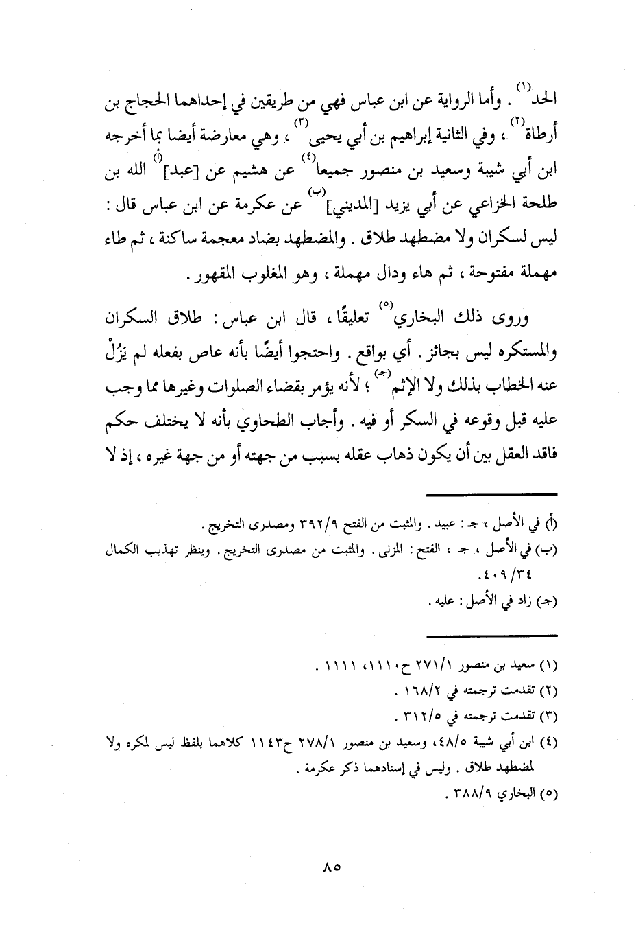 الحد (¬1). وأما الرواية عن ابن عباس فهي من طريقين في إحداهما الحجاج بن أرطاة (¬2)، وفي الثانية إبراهيم بن أبي يحيى (¬3)، وهي معارضة أيضًا بما أخرجه ابن أبي شيبة وسعيد بن منصور جميعا (¬4) عن هشيم عن [عبد] (أ) الله بن طلحة الخزاعي عن أبي يزيد [المديني] (ب) عن عكرمة عن ابن عباس قال: ليس لسكران ولا مضطهد طلاق. والمضطهد بضاد معجمة ساكنة، ثم طاء مهملة مفتوحة، ثم هاء ودال مهملة، وهو المغلوب المقهور.