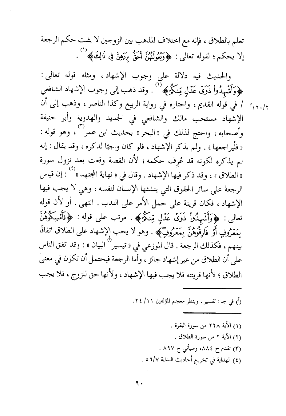 والحديث فيه دلالة على وجوب الإشهاد، ومثله قوله تعالى: {وَأَشْهِدُوا ذَوَيْ عَدْلٍ مِنْكُمْ} (¬2). وقد ذهب إلى وجوب الإشهاد الشافعي في قوله القديم، واختاره في رواية الربيع وكذا الناصر، وذهب إلى أن الإشهاد مستحب مالك والشافعي في الجديد والهدوية وأبو حنيفة وأصحابه، واحتج لذلك في "البحر" بحديث ابن عمر (¬3)، وهو قوله: "فلْيراجعها". ولم يذكر الإشهاد، فلو كان واجبًا لذكره، وقد يقال: إنه لم يذكره لكونه قد عُرِف حكمه؛ لأن القصة وقعت بعد نزول سورة "الطلاق"، وقد ذكر فيها الإشهاد. وقال في "نهاية المجتهد" (¬4): إن قياس الرجعة على سائر الحقوق التي ينشئها الإنسان لنفسه، وهي لا يجب فيها الإشهاد، فكان قرينة على حمل الأمر على الندب. انتهى. أو لأن قوله تعالى: {وَأَشْهِدُوا ذَوَيْ عَدْلٍ مِنْكُمْ}. مرتب على قوله: {فَأَمْسِكُوهُنَّ بِمَعْرُوفٍ أَوْ فَارِقُوهُنَّ بِمَعْرُوفٍ}. وهو لا يجب الإشهاد على الطلاق اتفاقًا بينهم، فكذلك الرجعة. قال الموزعي في "تيسير (أ) البيان": وقد اتفق الناس على أن الطلاق من غير إشهاد جائز، وأما الرجعة فيحتمل أن تكون في معنى الطلاق؛ لأنها قرينته فلا يجب فيها الإشهاد، ولأنها حق للزوج، فلا يجب