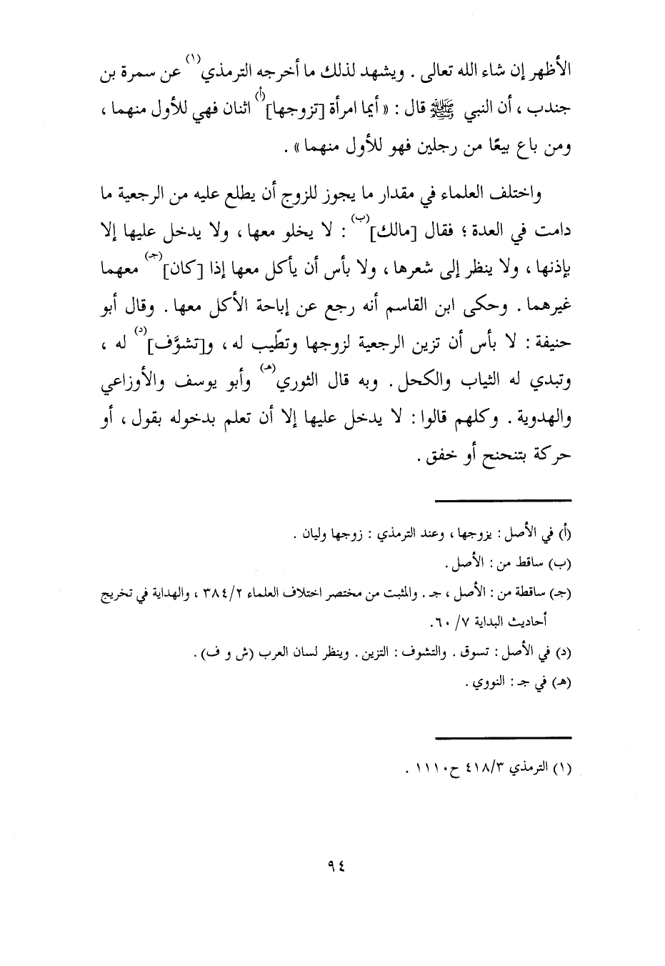 واختلف العلماء في مقدار ما يجوز للزوج أن يطلع عليه من الرجعية ما دامت في العدة؛ فقال [مالك] (ب): لا يخلو معها، ولا يدخل عليها إلا بإذنها، ولا ينظر إلى شعرها، ولا بأس أن يأكل معها إذا [كان] (جـ) معهما غيرهما. وحكى ابن القاسم أنه رجع عن إباحة الأكل معها. وقال أبو حنيفة: لا بأس أن تزين الرجعية لزوجها وتطّيب له، و [تشوَّف] (د) له، وتبدي له الثياب والكحل. وبه قال الثوري (هـ) وأبو يوسف والأوزاعي والهدوية. وكلهم قالوا: لا يدخل عليها إلا أن تعلم بدخوله بقول، أو حركة بتنحنح أو خفق.