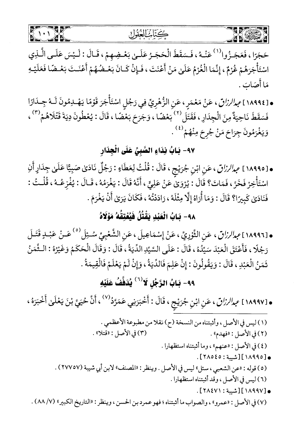 18996- عبد الرزاق، عَنِ الثَّورِيِّ، عَن إِسْمَاعِيلَ، عَنِ الشَّعْبِيِّ، سُئِلَ عَنْ عَبدٍ قَتَلَ رَجُلاً، فَأَعْتَقَ الْعَبْدَ سَيِّدُهُ، قَالَ: عَلَى السَّيِّدِ الدِّيَةُ، قَالَ: وَقَالَ الْحَكَمُ، وَغَيْرُهُ: الثَّمَنُ ثَمَنُ الْعَبْدِ، قَالَ: وَيَقُولُونَ: إِنْ عَلِمَ فَالدِّيَةُ، وَإِنْ لَمْ يَعْلَمْ فَالْقِيمَةُ.