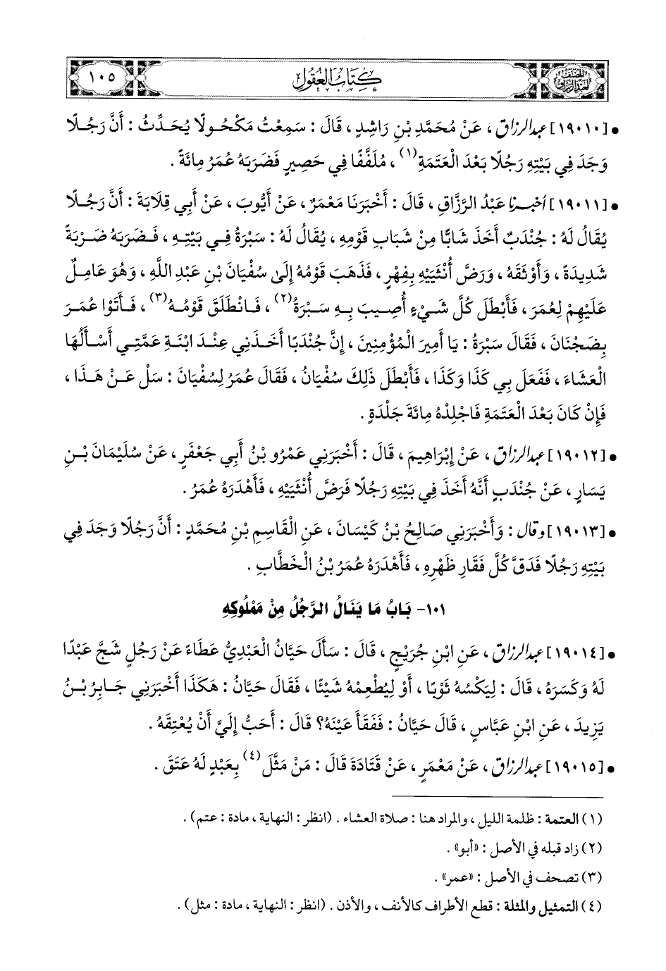 19011- أخبرنا عبد الرزاق، قَالَ: أَخْبَرَنَا مَعْمَرٌ، عَنْ أَيُّوبَ، عَنْ أَبِي قِلاَبَةَ، أَنَّ رَجُلاً يُقَالِ لَهُ: جُنْدُبٌ، أَخَذَ شَابًّا مِنْ شَبَابِ قَوْمِهِ، يُقَالُ لَهُ: سَبْرَةُ فِي بَيْتِهِ، فَضَرَبَهُ ضَرْبَةً شَدِيدَةً، وَأَوْثَقَهُ، وَرَضَّ أُنْثَيَيْهِ بِفِهْرٍ، فَذَهَبَ قَوْمُهُ إِلَى سُفْيَانَ بْنِ عَبْدِ اللهِ، وَهُوَ عَامِلٌ عَلَيْهِمْ لِعُمَرَ، فَأَبْطَلَ كُلَّ شَيْءٍ أُصِيبَ بِهِ سَبْرَةُ، فَانْطَلَقَ قَوْمُهُ، فَأَتَوْا عُمَرَ بِضَجْنَانَ، فَقَالَ سَبْرَةُ: يَا أَمِيرَ الْمُؤْمِنِينَ، إِنَّ جُنْدُبًا أَخَذَنِي عِنْدَ ابْنَةِ عَمَّتِي أَسْأَلُهَا الْعِشَاءَ، فَفَعَلَ بِي كَذَا وَكَذَا، فَأَبْطَلَ ذَلِكَ سُفْيَانُ، فَقَالَ عُمَرُ لِسُفْيَانَ: سَلْ عَنْ هَذَا، فَإِنْ كَانَ بَعْدَ الْعَتَمَةِ فَاجْلِدْهُ مِئَةَ جَلْدَةٍ.