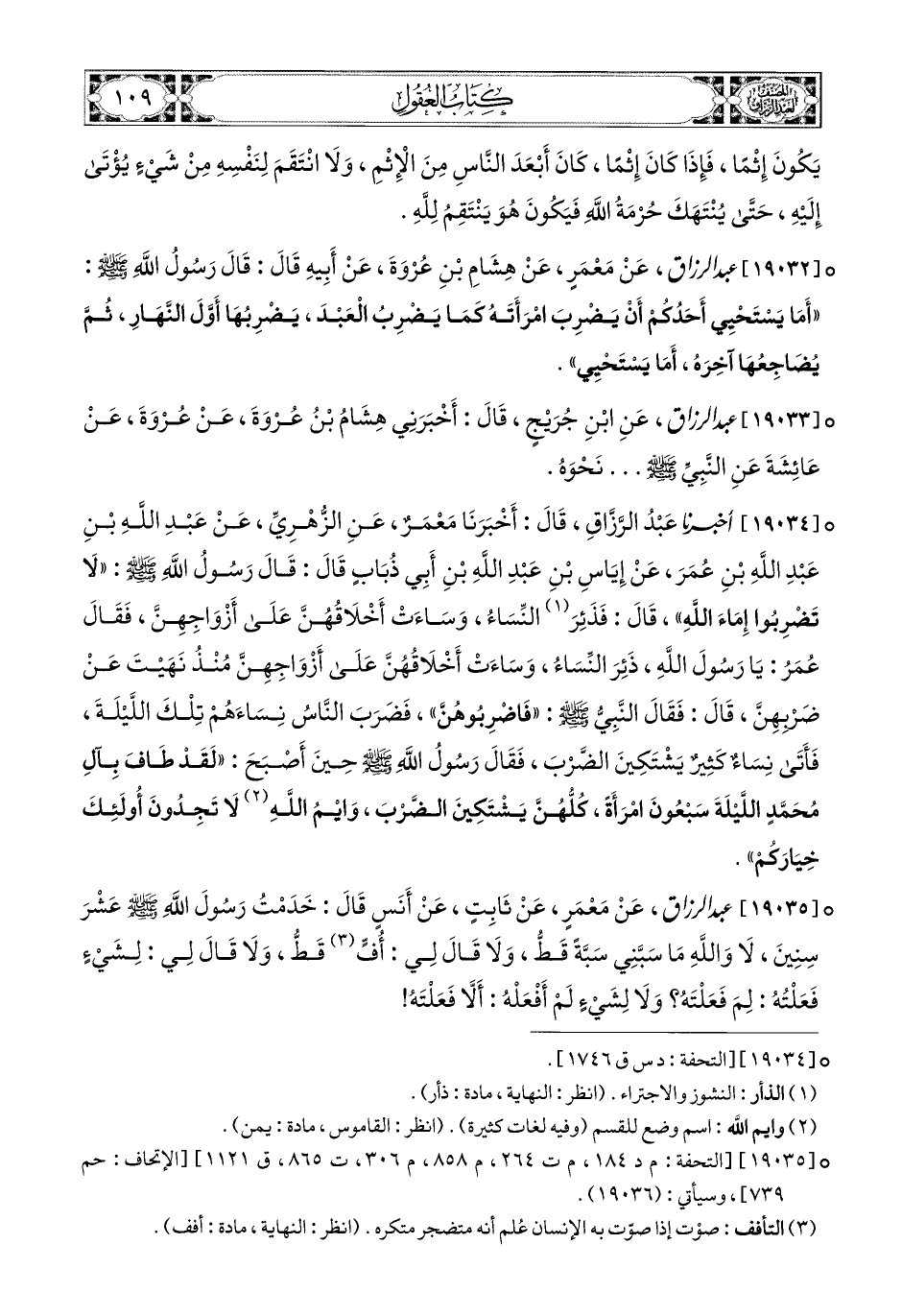 19032- عبد الرزاق، عَنْ مَعْمَرٍ، عَن هِشَامِ بْنِ عُرْوَةَ، عَنْ أَبِيهِ، قَالَ: قَالَ رَسُولُ اللهِ صَلَّى اللهُ عَلَيْهِ وَسَلَّمَ: أَمَا يَسْتَحْيِي أَحَدُكُمْ أَنْ يَضْرِبَ امْرَأَتَهُ كَمَا يَضْرِبُ الْعَبْدَ يَضْرِبُهَا أَوَّلَ النَّهَارِ، ثُمَّ يُضَاجِعُهَا آخِرَهُ أَمَا يَسْتَحْيِي.