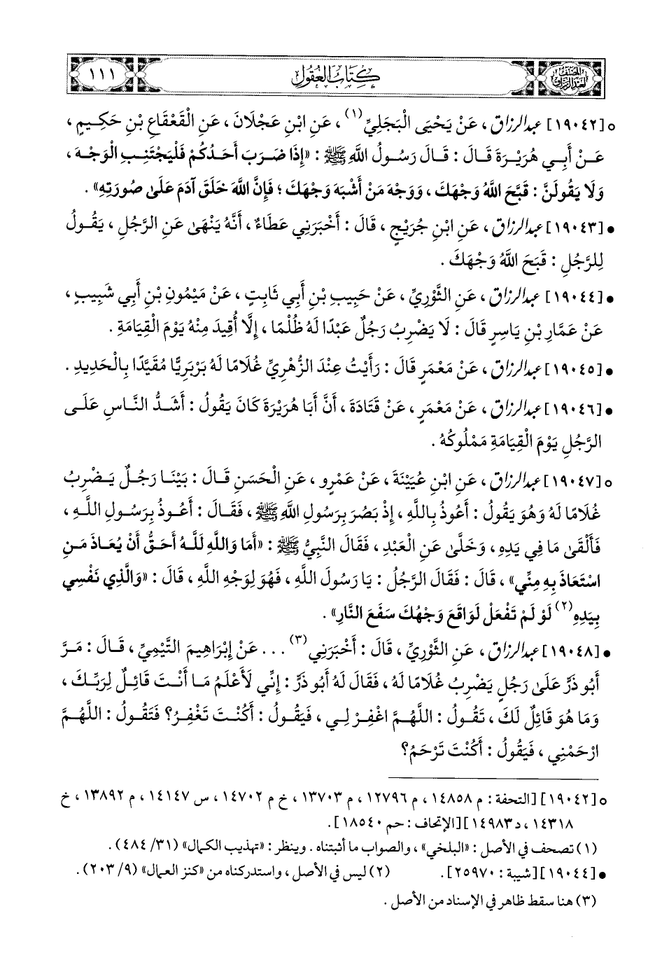 19047- عبد الرزاق، عَنِ ابْنِ عُيَيْنَةَ، عَنْ عَمْرٍو، عَنِ الْحَسَنِ، قَالَ: بَيْنَا رَجُلٌ يَضْرِبُ غُلاَمًا لَهُ وَهُوَ يَقُولُ: أَعُوذُ بِاللهُ، إِذْ بَصُرَ بِرَسُولِ اللهِ صَلَّى اللهُ عَلَيْهِ وَسَلَّمَ، فَقَالَ: أَعُوذُ بِرَسُولِ اللهِ، فَأَلْقَى مَا فِي يَدِهِ، وَخَلَّى عَنِ الْعَبْدِ، فَقَالَ النَّبِيُّ صَلَّى اللهُ عَلَيْهِ وَسَلَّمَ: أَمَا وَاللهِ لَلَّهُ أَحَقُّ أَنْ يُعَاذَ مَنِ اسْتَعَاذَ بِهِ مِنِّي، قَالَ: فَقَالَ الرَّجُلُ: يَا رَسُولَ اللهِ، فَهُوَ لِوَجْهِ اللهُ، قَالَ: وَالَّذِي نَفْسِي بِيَدِهِ، لَوْ لَمْ تَفْعَلْ لَوَاقَعَ وَجْهُكَ سَفْعَ النَّارِ.