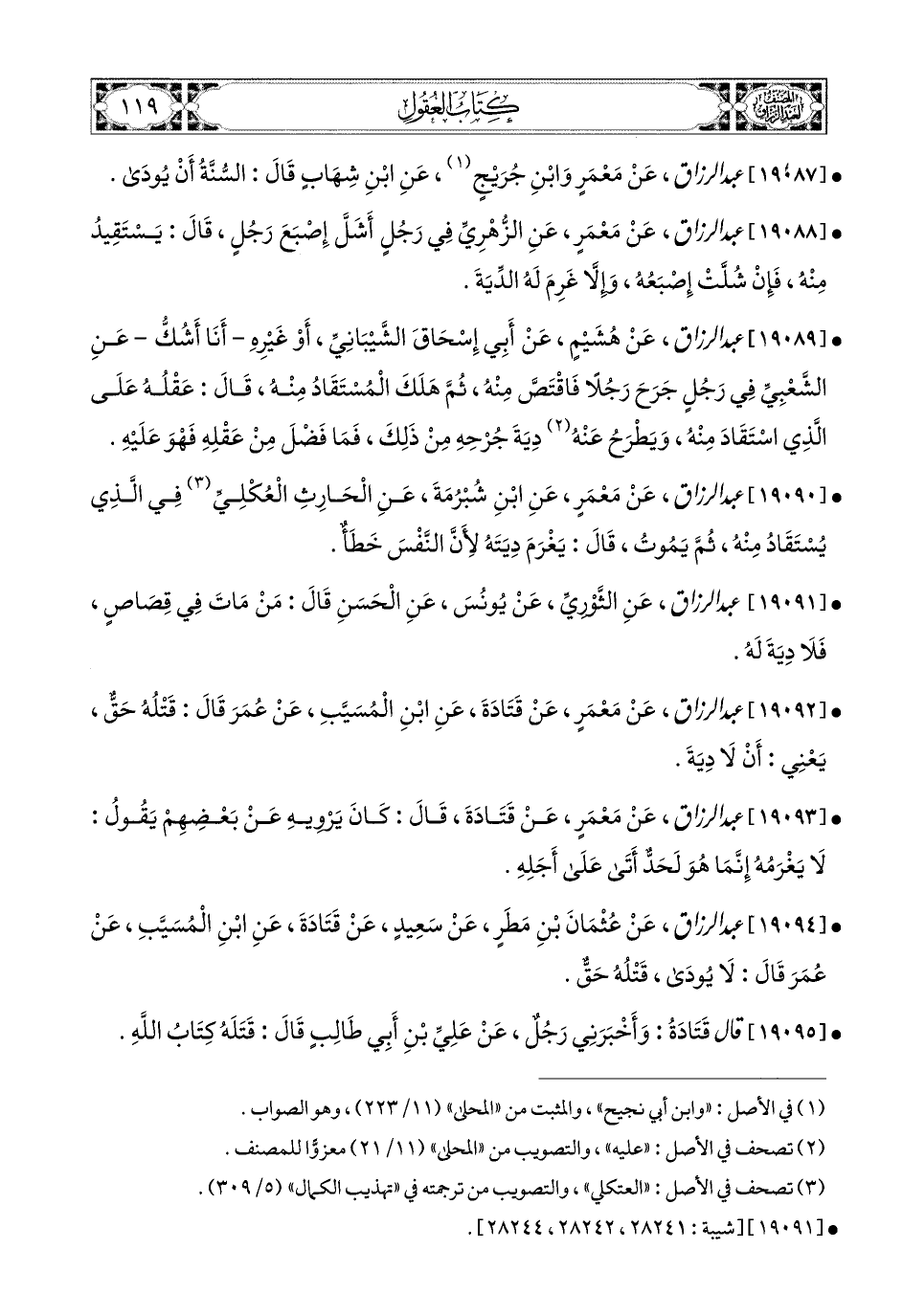 19089- عبد الرزاق، عَن هُشَيْمٍ، عَنْ أَبِي إِسْحَاقَ الشَّيْبَانِيِّ، أَوْ غَيْرِهِ أَنَا أَشُكُّ، عَنِ الشَّعْبِيِّ؛ فِي رَجُلٍ جَرَحَ رَجُلاً، فَاقْتَصَّ مِنْهُ، ثُمَّ هَلَكَ المُسْتَقَادُ مِنْهُ، قَالَ: عَقْلُهُ عَلَى الَّذِي اسْتَقَادَ مِنْهُ، وَيَطْرَحُ عَنْهُ دِيَةَ جُرْحِهِ مِنْ ذَلِكَ، فَمَا فَضَلَ مِنْ عَقْلِهِ فَهُوَ عَلَيْهِ.