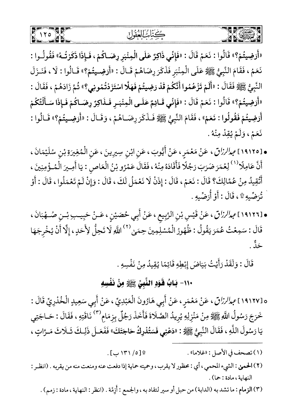 19127- عبد الرزاق، عَنْ مَعْمَرٍ، عَنْ أَبِي هَارُونَ الْعَبْدِيِّ، عَنْ أَبِي سَعيدٍ الْخُدْرِيِّ قَالَ: خَرَجَ رَسُولُ اللهِ صَلَّى اللهُ عَلَيْهِ وَسَلَّمَ مِنْ مَنْزِلِهِ يُرِيدُ الصَّلاَةَ، فَأَخَذَ رَجُلٌ بِزِمَامِ نَاقَتِهِ، فَقَالَ: حَاجَتِي يَا رَسُولَ اللهِ، فَقَالَ النَّبِيُّ صَلَّى اللهُ عَلَيْهِ وَسَلَّمَ: دَعْنِي فَسَتُدْرِكُ حَاجَتَكَ، فَفَعَلَ ذَلِكَ ثَلاَثَ مَرَّاتٍ، وَالرَّجُلُ يَأْبَى، فَرَفَعَ النَّبِيُّ صَلَّى اللهُ عَلَيْهِ وَسَلَّمَ عَلَيْهِ السَّوْطَ فَضَرَبَهُ، وَقَالَ: دَعْنِي سَتُدْرِكُ حَاجَتَكَ، فَصَلَّى بِالنَّاسِ، فَلَمَّا فَرَغَ قَالَ: أَيْنَ الرَّجُلُ الَّذِي جَلَدْتُ آنِفًا؟ قَالَ: فَنَظَرَ النَّاسُ بَعْضُهُمْ إِلَى بَعْضٍ، وَقَالُوا: مَنْ هَذَا الَّذِي جَلَدَهُ رَسُولُ اللهِ صَلَّى اللهُ عَلَيْهِ وَسَلَّمَ؟ فَجَاءَ الرَّجُلُ مِنْ آخَرِ الصُّفُوفِ، فَقَالَ: أَعُوذُ بِاللهُ مِنْ غَضَبِ اللهُ وَغَضِبِ رَسُولِهِ، فَقَالَ لَهُ النَّبِيُّ صَلَّى اللهُ عَلَيْهِ وَسَلَّمَ: ادْنُ فَاقْتَصَّ، فَرَمَى إِلَيْهِ بِالسَّوْطِ، قَالَ: بَلْ أَعْفُو، قَالَ: أَوَتَعْفُو؟ فَقَالَ: إِنِّي قَدْ عَفَوْتُ، فَقَالَ رَسُولُ اللهِ صَلَّى اللهُ عَلَيْهِ وَسَلَّمَ: وَالَّذِي نَفْسِي بِيَدِهِ، لاَ يَظْلِمُ مُؤْمِنٌ مُؤْمِنًا، فَلاَ يُعْطِيهِ مَظْلَمَتَهُ فِي الدُّنْيَا، إِلاَّ انْتَقَمَ اللهُ لَهُ مِنْهُ يَوْمَ الْقِيَامَةِ، قَالَ: فَقَالَ أَبو ذَرٍّ: يَا نَبِيَّ اللهُ، أَتَذْكُرُ لَيْلَةَ كُنْتُ أَقُودُ بِكَ الرَّاحِلَةَ، فَإِذَا قُدْتُهَا أَبْطَأتْ، وَإِذَا سُقْتُهَا اعْتَرَضَتْ، وَأَنْتَ نَاعِسٌ عَلَيْهِا، فَخَفَقْتُ رَأْسَكَ بِالمِخْفَقَةِ، وَقُلْتُ: إِليكَ، أَتَاكَ الْقَوْمُ، قَالَ: نَعَمْ، قَالَ: فَاسْتَقِدْ مِنِّي يَا رَسُولَ اللهِ، قَالَ: بَلْ أَعْفُو، قَالَ: بَلِ اسْتَقِدْ مِنِّي أَحَبُّ إِلَيَّ، قَالَ: فَضَرَبَهُ النَّبِيُّ صَلَّى اللهُ عَلَيْهِ وَسَلَّمَ ضَرْبَةً بِالسَّوْطِ، رَأَيْتُهُ يَتَضَوَّرُ مِنْهَا.