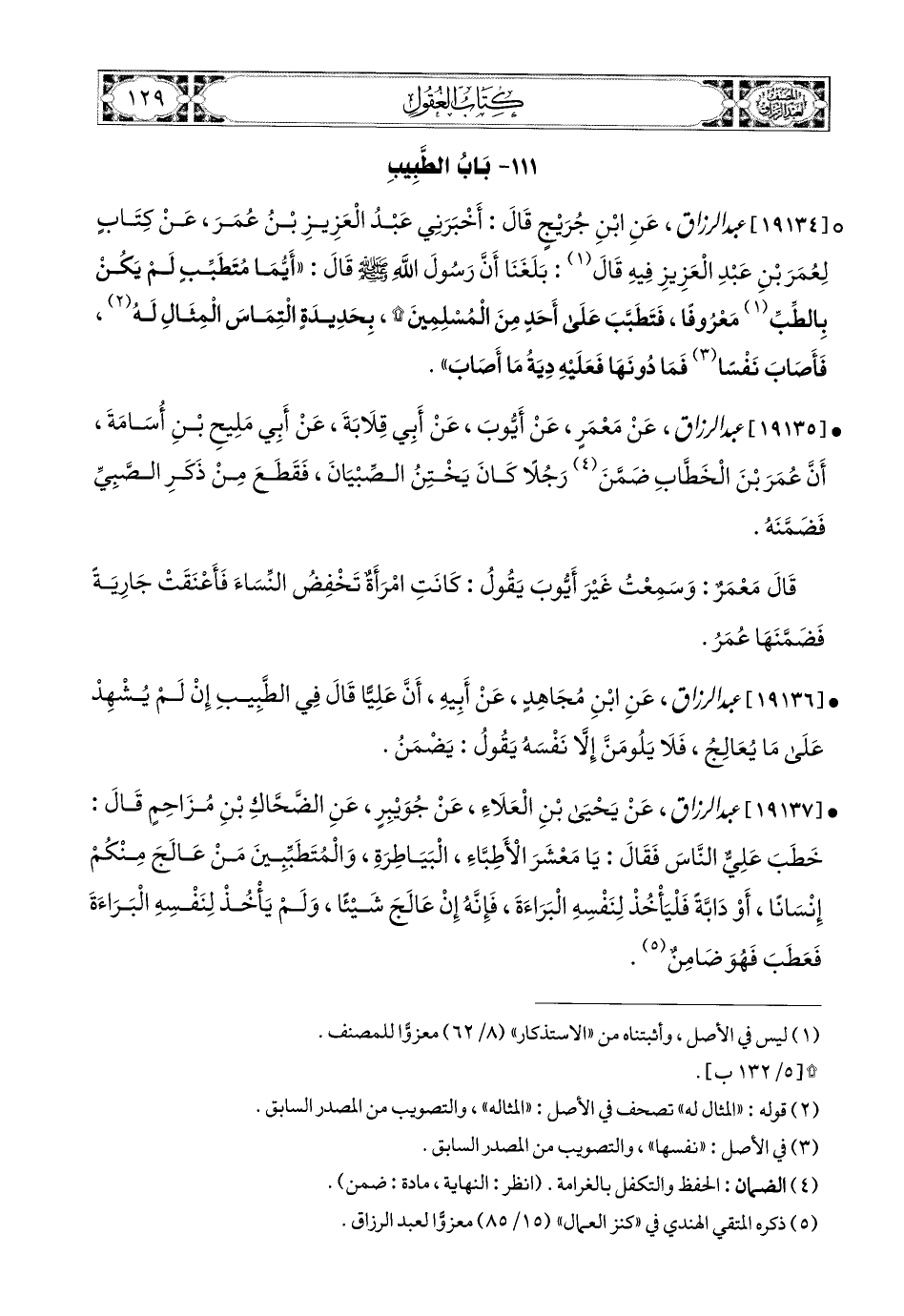 19137- عبد الرزاق، عَن يَحيَى بنِ الْعَلاَءِ، عَن جُوَيْبِرٍ، عَنِ الضَّحَّاكِ بْنِ مُزَاحِمٍ، قَالَ: خَطَبَ عَلِيٌّ النَّاسَ فَقَالَ: يَا مَعْشَرَ الأَطِبَّاءِ الْبَيَاطِرَةِ، وَالمُتَطَبِّبِينَ مَنْ عَالَجَ مِنْكُمْ إِنْسَانًا، أَوْ دَابَّةً، فَلْيَأْخُذْ لِنَفْسِهِ الْبَرَاءَةَ، فَإِنَّهُ إِنْ عَالَجَ شَيْئًا، وَلَمْ يَأْخُذْ لِنَفْسِهِ الْبَرَاءَةَ، فَعَطَبَ، فَهُوَ ضَامِنٌ.