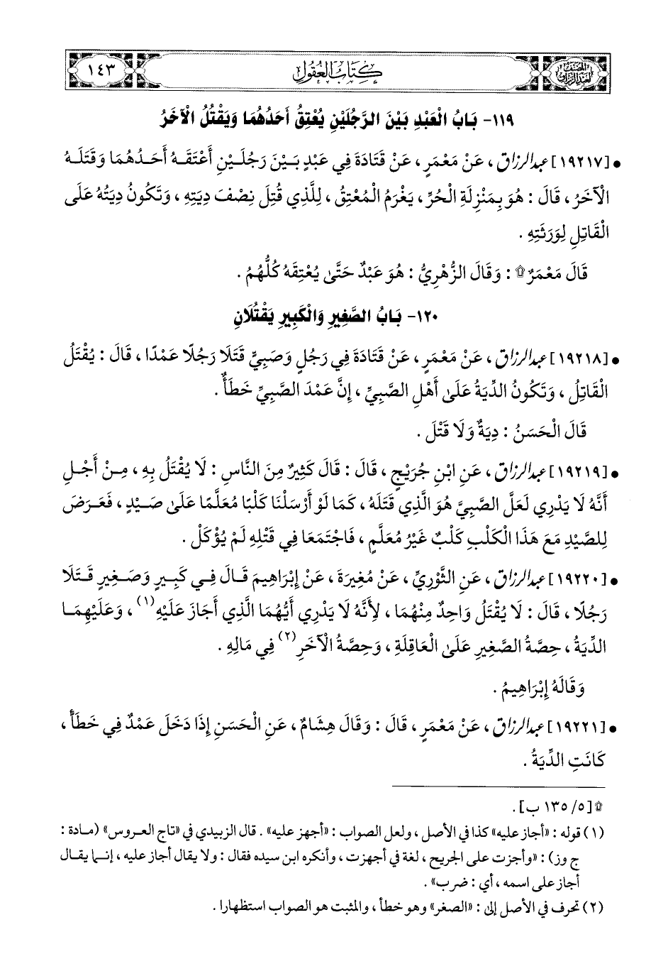 19220- عبد الرزاق، عَنِ الثَّورِيِّ، عَن مُغِيرَةَ، عَن إِبرَاهِيمَ، قَالَ فِي كَبِيرٍ وَصَغِيرٍ قَتَلاَ رَجُلاً، قَالَ: لاَ يُقْتَلُ وَاحِدٌ مِنْهُمَا، لأَنَّهُ لاَ يَدْرِي أَيُّهُمَا الَّذِي أَجَازَ عَلَيْهِ، وَعَلَيْهِمَا الدِّيَةُ حِصَّةُ الصَّغِيرِ عَلَى الْعَاقِلَةِ، وَحِصَّةُ الآخَرِ فِي مَالِهِ.