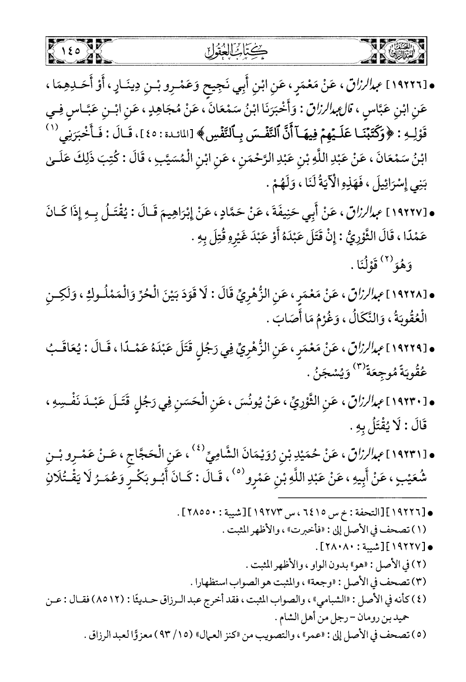 19229- عبد الرزاق، عَنْ مَعْمَرٍ، عَنِ الزُّهْرِيِّ؛ فِي رَجُلٍ قَتَلَ عَبدَهُ عَمْدًا، قَالَ: يُعَاقَبُ عُقُوبَةً مُوجِعَةً وَيُسْجَنُ.