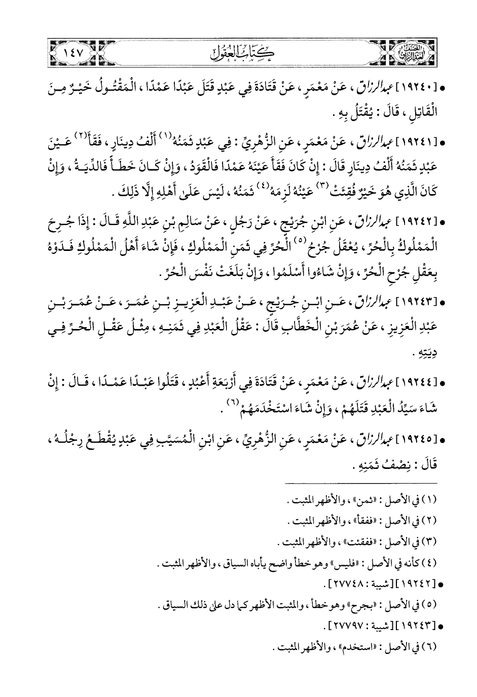 19245- عبد الرزاق، عَنْ مَعْمَرٍ، عَنِ الزُّهْرِيِّ، عَنِ ابْنِ المُسَيَّبِ، فِي عَبدٍ يُقْطَعُ رِجْلُهُ؟ قَالَ: نِصْفُ ثَمَنِهِ.