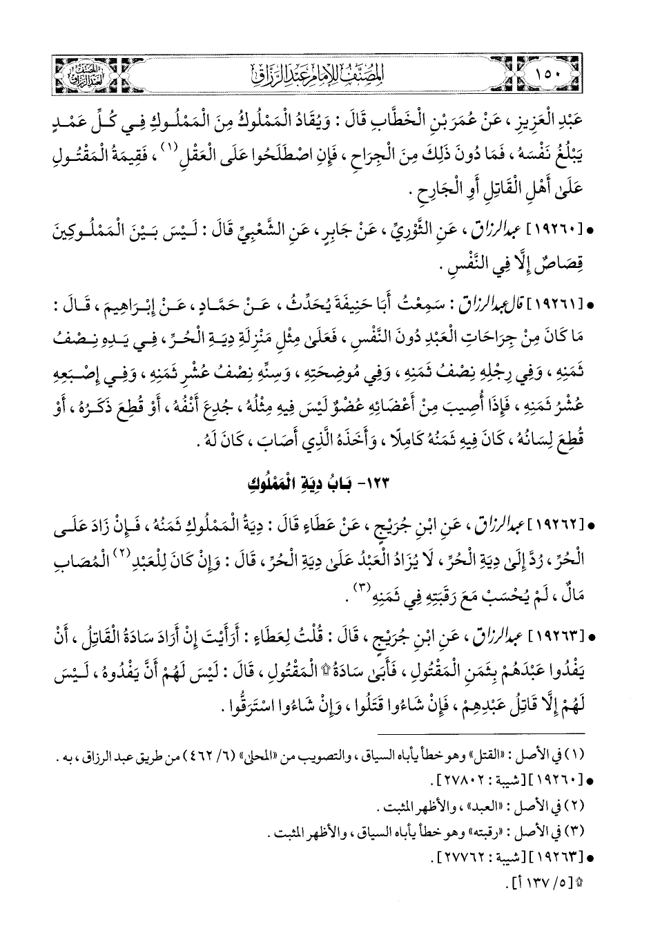 19262- عبد الرزاق، عَنِ ابْنِ جُرَيْجٍ، عَنْ عَطَاءٍ، قَالَ: دِيَةُ المَمْلُوكِ ثَمَنُهُ، فَإِنْ زَادَ عَلَى الْحُرِّ، رُدَّ إِلَى دِيَةِ الْحُرِّ، لاَ يُزَادُ الْعَبْدُ عَلَى دِيَةِ الْحُرِّ، قَالَ: وَإِنْ كَان لِلْعَبْدِ المُصَابِ مَالٌ لَمْ يُحْسَبْ مَعَ رَقَبَتِهِ فِي ثَمَنِهِ.