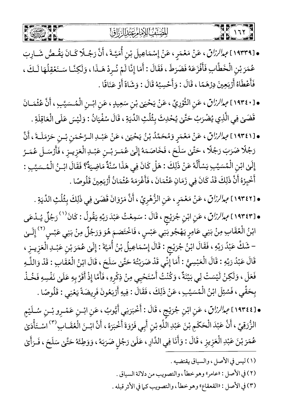 19344- عبد الرزاق، عَنِ ابْنِ جُرَيْجٍ، قَالَ: أَخْبَرَنِي أَيُّوبُ، عَنِ ابْنِ عَمْرِو بنِ سُلَيْمٍ الزُّرَقِيِّ، أَنَّ عَبدَ الْحَكَمِ بن عَبدِ اللهِ بْنِ أَبِي فَرْوَةَ، أَخْبَرَهُ أَنَّ ابْنَ الْعُقَابِ اسْتَأْدَى عُمَرَ بن عَبدِ الْعَزِيزِ، قَالَ: وَأَنَا فِي الدَّارِ، عَلَى رَجُلٍ ضَرَبَهُ، وَوَطِئَهُ حَتَّى سَلَحَ، فَرَأَى عُمَرُ بن عَبدِ الْعَزِيزِ سُلَيْمَانَ بن يَسَارٍ فِي الدَّارِ فَدَعَاهُ فَسَأَلَهُ، فَلَمْ يَجِدْ عِنْدَهُ عِلْمًا، فَأَرْسَلَ حُرَسِيًّا، إِلَى سَعيدِ بْنِ المُسَيَّبِ فَرَجَعَ إِلَى عُمَرَ بِشَيْءٍ لاَ أَدْرِي مَا هُوَ، قَالَ: فَلَمَّا خَرَجْنَا سَأَلْنَا مَا الَّذِي رَجَعَ إِلَيْهِ ابْنُ المُسَيَّبِ؟ قَالَ: قَضَى عُثْمَانُ فِي رَجُلٍ ضَرَبَ رَجُلاً وَوَطِئَهُ حَتَّى سَلَحَ بِأَرْبَعِينَ فَرِيضَةً، قَالَ ابْنُ المُسَيَّبِ: وَرَأَيْتُ تِلْكَ الإِبِلَ الَّتِي قَضَى بِهَا عُثْمَانُ مُعَلَّمَةً بِحَلْقَةٍ فِيهَا خَطٌّ.
