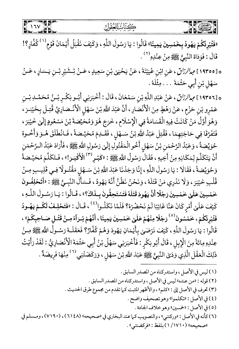 19356 - عبد الرزاق، عَنْ عَبدِ اللهِ بْنِ سَمْعَانَ، قَالَ: أَخْبَرَنِي أَبو بَكْرِ بن مُحَمَّدِ بْنِ عَمْرِو بنِ حَزْمٍ، عَن رَهْطٍ مِنَ الأَنْصَارِ، أَنَّ عَبدَ اللهِ بن سَهْلٍ الأَنْصَارِيَّ قُتِلَ بِخَيْبَرَ، وَهُوَ أَوَّلُ مَنْ كَانَتْ فِيهِ الْقَسَامَةُ فِي الإِسْلاَمِ، خَرَجَ هُوَ وَمُحَيِّصَةُ بن مَسْعُودٍ إِلَى خَيْبَرَ، فَتَفَرَّقَا فِي حَاجَتِهِمَا، فَقُتِلَ عَبدُ اللهِ بن سَهْلٍ، فَقَدِمَ مُحَيِّصَةُ، فَانْطَلَقَ هُوَ وَأَخُوهُ حُوَيِّصَةُ، وَعَبْدُ الرَّحْمَنِ بن سَهْلٍ أَخُو المَقْتُولِ إِلَى رَسُولِ اللهِ صَلَّى اللهُ عَلَيْهِ وَسَلَّمَ، فَأَرَادَ عَبدُ الرَّحْمَنِ أَنْ يَتَكَلَّمَ لِمَكَانِهِ مِنْ أَخِيهِ، فَقَالَ رَسُولُ اللهِ صَلَّى اللهُ عَلَيْهِ وَسَلَّمَ: كَبِّرِ الأَكْبَرَ، فَتَكَلَّمَ مُحَيِّصَةُ، وَحُوَيِّصَةُ، فَقَالاَ: يَا رَسُولَ اللهِ، إِنَّا وَجَدْنَا عَبدَ اللهِ بن سَهْلٍ مَقْتُولاً فِي قَلِيبٍ مِنْ قُلُبِ خَيْبَرَ، وَلاَ نَدْرِي مَنْ قَتَلَهُ، وَنَحْنُ نَظُنُّ أَنَّهُ يَهُودُ، فَسَأَلَ النَّبِيُّ صَلَّى اللهُ عَلَيْهِ وَسَلَّمَ: أَتَحْلِفُونَ خَمْسِينَ [يَمِينًا] (1) عَلَى خَمْسِينَ رَجُلاً أَنَّ يَهُودَ قَتَلَهُ، فَتَسْتَحِقُّونَ بِذَاكَ؟ قَالُوا: يَا رَسُولَ اللهِ، كَيْفَ عَلَى أَمْرٍ كَانَ عَنَّا غَائِبًا لَمْ نَحْضُرْهُ، فَلَمَّا نَكَلَوا (2) قَالَ: فَتَحْلِفُ لَكُمْ يَهُودُ، فَتُبْرِئُكُمْ خَمْسُونَ رَجُلاً مِنْهُمْ عَلَى خَمْسِينَ يَمِينًا أَنَّهُمْ بُرَآءُ مِنْ قَتْلِ صَاحِبِكُمْ، قَالُوا: يَا رَسُولَ اللهِ، كَيْفَ نَرْضَى بِأَيْمَانِ يَهُودَ وَهُمْ كُفَّارٌ، فَعَقَلَهُ رَسُولُ اللهِ صَلَّى اللهُ عَلَيْهِ وَسَلَّمَ مِنْ عِنْدِهِ مِئَةً مِنَ الإِبِلِ.