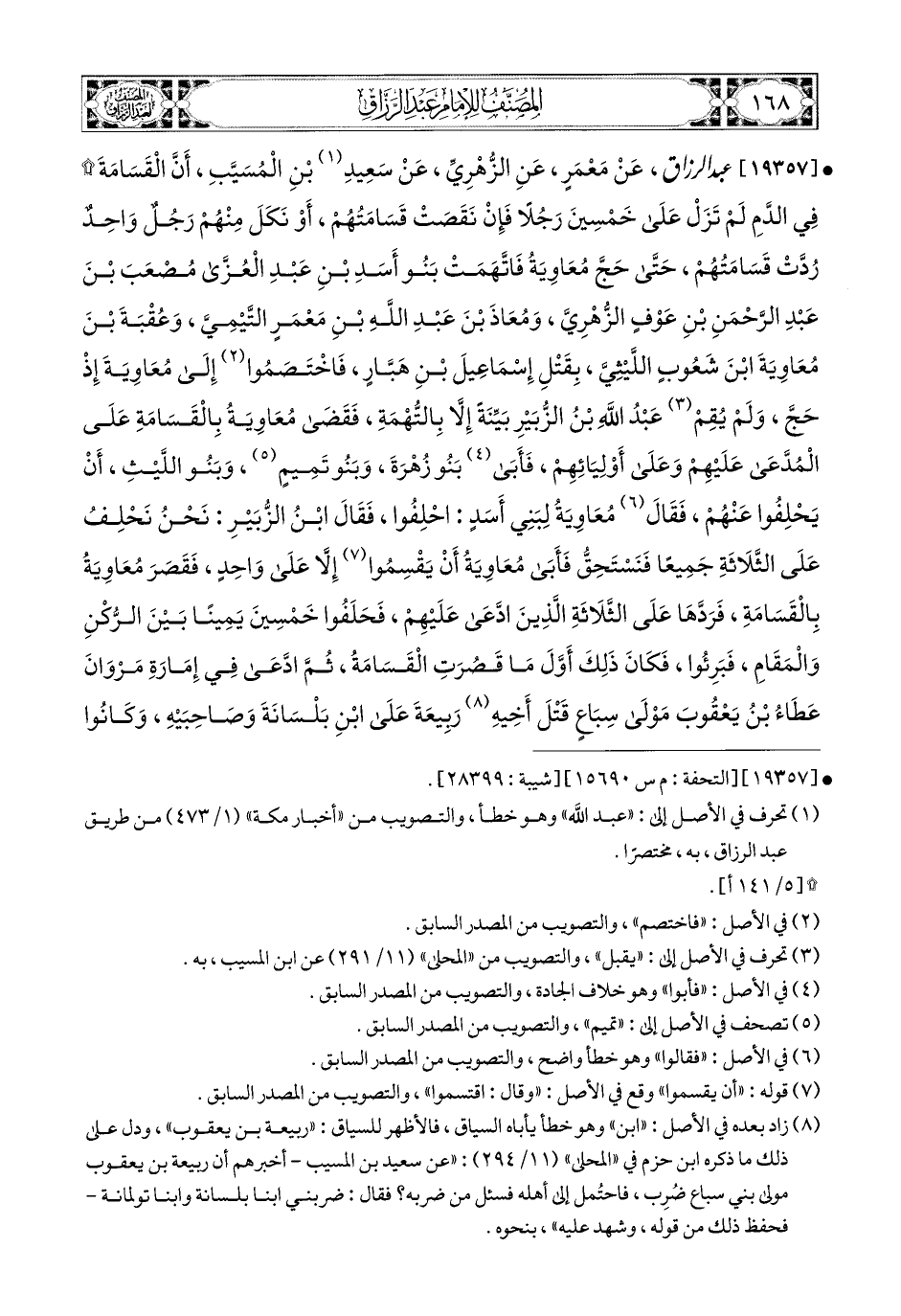 19357- عبد الرزاق، عَنْ مَعْمَرٍ، عَنِ الزُّهْرِيِّ، عَن سَعيدِ بْنِ المُسَيَّبِ؛ أَنَّ الْقَسَامَةَ فِي الدَّمِ لَمْ تَزَلْ عَلَى خَمْسِينَ رَجُلاً، فَإِنْ نَقَصَتْ قَسَامَتُهُمْ، أَوْ نَكَلَ مِنْهُمْ رَجُلٌ وَاحِدٌ رُدَّتْ قَسَامَتُهُمْ، حَتَّى حَجَّ مُعَاوِيَةُ، فاتَّهَمَتْ بَنُو أَسَدِ بْنِ عَبدِ الْعُزَّى مُصْعَبَ بن عَبدِ الرَّحْمَنِ بْنِ عَوْفٍ الزُّهْرِيَّ، وَمُعَاذَ بن عَبدِ اللهِ بْنِ مَعْمَرٍ التَّيْمِيَّ، وَعُقْبَةَ بن مُعَاوِيَةَ ابْنَ شَعُوبٍ اللَّيْثِيَّ بِقَتْلِ إِسْمَاعِيلَ بْنِ هَبَّارٍ، فَاخْتَصَمُوا إِلَى مُعَاوِيَةَ إِذْ حَجَّ، وَلَمْ يُقِمْ عَبدُ اللهِ بن الزُّبَيْرِ بَيِّنَةً إِلاَّ بالتُّهْمةِ، فَقَضَى مُعَاوِيَةُ بِالْقَسَامَةِ عَلَى المُدَّعَى عَلَيْهِمْ، وَعَلَى أَوْلِيَائِهِمْ، فَأَبَا بَنُو زُهْرَةَ، وَبَنُو تَمِيمٍ، وَبَنُو اللَّيْثِ، أَنْ يَحْلِفُوا عَنْهُمْ، فَقَالَ مُعَاوِيَةُ لِبَنِي أَسَدٍ: احْلِفُوا. فَقَالَ ابْنُ الزُّبَيْرِ: نَحْنُ نَحْلِفُ عَلَى الثَّلاَثَةِ جَمِيعًا فَنَسْتَحِقُّ، فَأَبَى مُعَاوِيَةُ أَنْ يَقْسِمُوا إِلاَّ عَلَى وَاحِدٍ، فَقَصَرَ مُعَاوِيَةُ بِالْقَسَامَةِ، فَرَدَّهَا عَلَى الثَّلاَثَةِ الَّذِينَ ادَّعَى عَلَيْهِمْ، فَحَلَفُوا خَمْسِينَ يَمِينًا بَيْنَ الرُّكْنِ وَالمَقَامِ فَبَرِئُوا، فَكَانَ ذَلِكَ أَوَّلَ مَا قَصُرَتِ الْقَسَامَةُ.