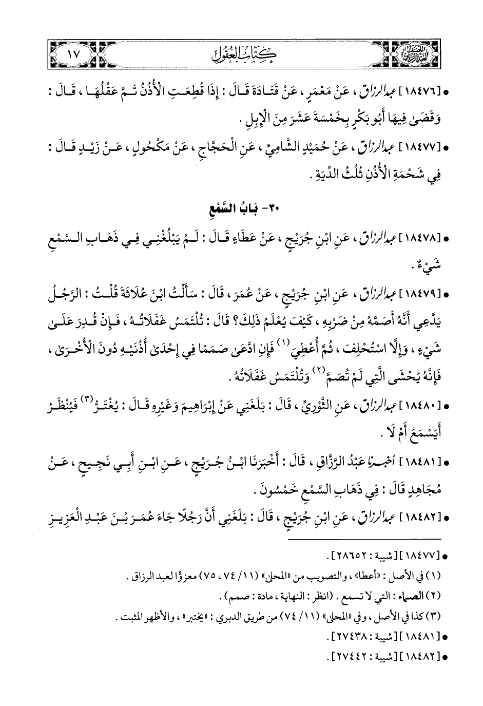18478- عبد الرزاق، عَنِ ابْنِ جُرَيْجٍ، عَنْ عَطَاءٍ، قَالَ: لَمْ يَبْلُغْنِي فِي ذَهَابِ السَّمْعِ شَيْءٌ.