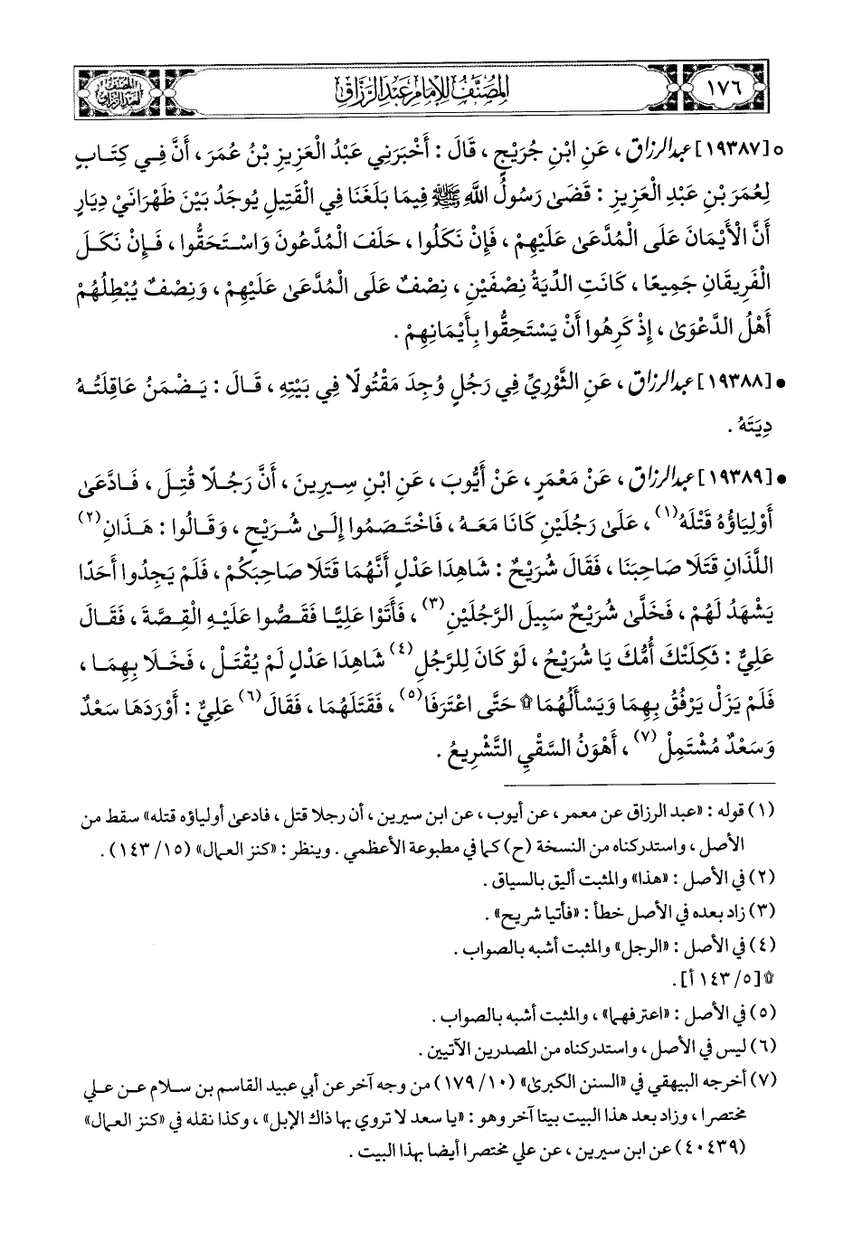 19387- عبد الرزاق، عَنِ ابْنِ جُرَيْجٍ، قَالَ: أَخْبَرَنِي عَبدُ الْعَزِيزِ بن عُمَرَ، أَنَّ فِي كِتَابٍ لِعُمَرَ بْنِ عَبدِ الْعَزِيزِ: قَضَى رَسُولُ اللهِ صَلَّى اللهُ عَلَيْهِ وَسَلَّمَ فِيمَا بَلَغَنَا فِي الْقَتِيلِ يُوجَدُ بَيْنَ ظَهْرَانَيْ دِيَارٍ أَنَّ الأَيْمَانَ عَلَى المُدَّعَى عَلَيْهِمْ، فَإِنْ نَكَلُوا، حَلَفَ المُدَّعُونَ واسْتَحَقُّوا، فَإِنْ نَكَلَ الفَرِيقَانِ جَمِيعًا، كَانَتِ الدِّيَةُ نِصْفَيْنِ، نِصْفٌ عَلَى المُدَّعَى عَلَيْهِمْ، وَنِصْفٌ يُبْطِلُهُم أَهْلُ الدَّعْوَى، إِذْ كَرِهُوا أَنْ يَسْتَحِقُّوا بِأَيْمَانِهِمْ.