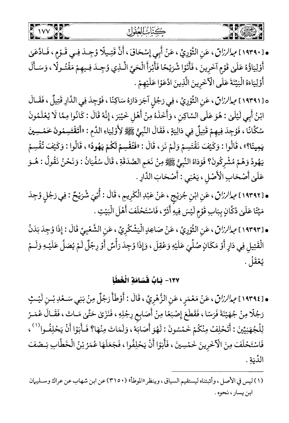 19391- عبد الرزاق، عَنِ الثَّورِيِّ؛ فِي رَجُلٍ آجَرَ دَارَهُ سَاكِنًا، فَوُجِدَ فِي الدَّارِ قَتِيلٌ، فَقَالَ ابْنُ أَبِي لَيْلَى: هُوَ عَلَى السَّاكِنِ، وَأَخَذَهُ مِنْ أَهْلِ خَيْبَرَ، إِنَّهُ قَالَ: كَانُوا مِمَّا لاَ يُعْلَمُونَ سُكَّانًا، فَوُجِدَ فِيهِمْ قَتِيلٌ فِي دَالية، فَقَالَ النَّبِيُّ صَلَّى اللهُ عَلَيْهِ وَسَلَّمَ لأَوْلِيَاءِ الدَّمِ: أَتَقْتَسِمُونَ خَمْسِينَ يَمِينًا؟ قَالُوا: وَكَيْفَ نَقْتَسِمُ وَلَمْ نَرَ؟ قَالَ: فَتُقْسِمُ لَكُمْ يَهُودُ؟ قَالُوا: وَكَيَفَ تُقْسِمُ يَهُودُ وَهُمْ مُشْرِكُونَ؟ فَوَدَاهُ النَّبِيُّ صَلَّى اللهُ عَلَيْهِ وَسَلَّمَ مِنْ نَعَمِ الصَّدَقَةِ.
