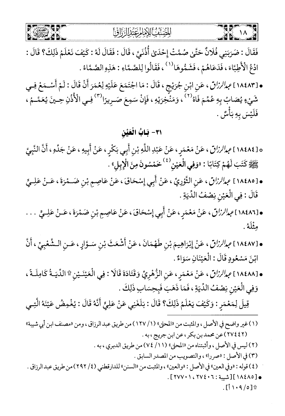 18484- عبد الرزاق، عَنْ مَعْمَرٍ، عَنْ عَبدِ اللهِ بْنِ أَبِي بَكْرٍ، عَنْ أَبِيهِ، عَن جَدِّهِ، أَنَّ النَّبِيَّ صَلَّى اللهُ عَلَيْهِ وَسَلَّمَ كَتَبَ لَهُمْ كِتَابًا: وَفِي الْعَيْنِ خَمْسُونَ مِنَ الإِبِلِ.