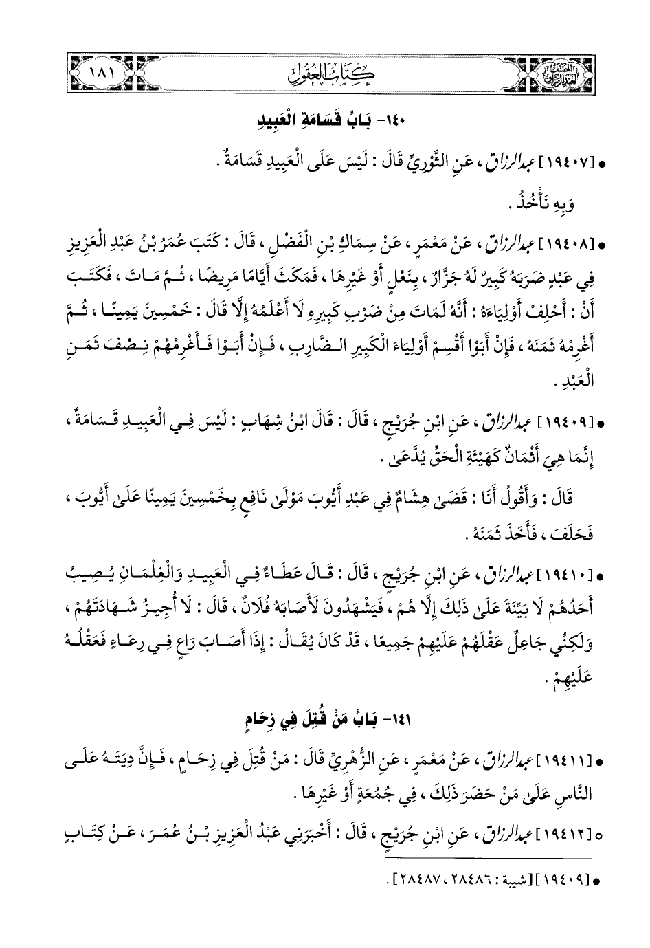 19409- عبد الرزاق، عَنِ ابْنِ جُرَيْجٍ، قَالَ: قَالَ ابْنُ شِهَابٍ: لَيْسَ فِي الْعَبِيدِ قَسَامَةٌ، إِنَّمَا هِيَ أَثْمَانٌ، كَهَيْئَةِ الْحَقِّ يُدَّعَى، قَالَ: وَأَقُولُ أَنَا: قَضَى هِشَامٌ فِي عَبدِ أَيُّوبَ، مَوْلَى نَافِعٍ بِخَمْسِينَ يَمِينًا عَلَى أَيُّوبَ، فَحَلَفَ، فَأَخَذَ ثَمَنَهُ.