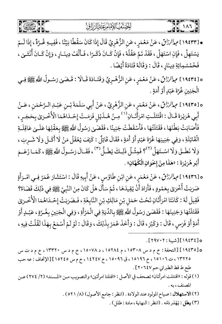 19436- عبد الرزاق، عَنْ مَعْمَرٍ، عَنِ ابْنِ طَاوُوسٍ، عَنْ أَبِيهِ، قَالَ: اسْتَشَارَ عُمَرُ فِي امْرَأَةٍ ضَرَبَتْ أُخْرَى بِعَمُودٍ، فَأَرَادَ أَنْ يُقِيدَهَا، ثُمَّ سَأَلَ: هَلْ كَانَ مِنَ النَّبِيِّ صَلَّى اللهُ عَلَيْهِ وَسَلَّمَ فِي ذَلِكَ قَضَاءٌ؟ فَقِيلَ لَهُ: كَانَتَا امْرَأَتَانِ تَحْتَ حَمَلِ بْنِ مَالِكِ بْنِ النَّابِغَةِ، فَضَرَبَتْ إِحْدَاهُمَا الأُخْرَى، فَقَتَلَتْهَا وَجَنِينَهَا، فَقَضَى رَسُولُ اللهِ صَلَّى اللهُ عَلَيْهِ وَسَلَّمَ بِالدِّيَةِ فِي المَرْأَةِ، وَفِي الْجَنِينِ بِغُرَّةٍ عَبدٍ، أَوْ أَمَةٍ، أَوْ فَرَسٍ، قَالَ: وَكَبَّرَ، قَالَ: وَأَخَذَ عُمَرُ بِذَلِكَ، وَقَالَ: لَوْ لَمْ أَسْمَعْ بِهَذَا لَقُلْتُ فِيهِ، فَقَالَ الرَّجُلُ: يَا رَسُولَ اللهِ، كَيْفَ أَعْقِلُ مَنْ لاَ أَكَلَ، وَلاَ شَرِبَ، وَلاَ نَطَقَ، وَلاَ اسْتَهَلَّ؟ وَمِثْلُ هَذَا يُطَلُّ.