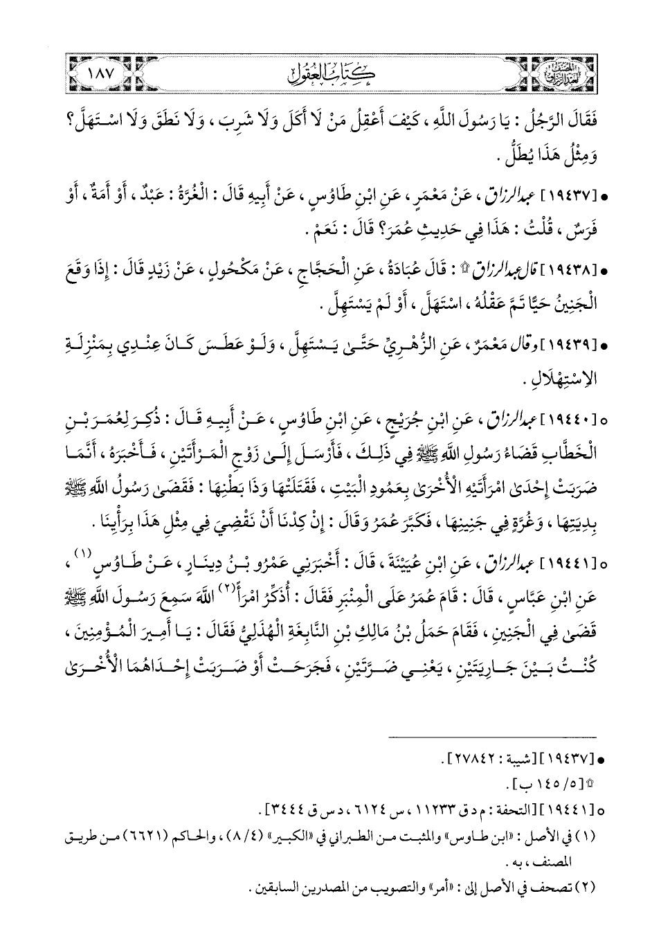 19440- عبد الرزاق، عَنِ ابْنِ جُرَيْجٍ، عَنِ ابْنِ طَاوُوسٍ، عَنْ أَبِيهِ، قَالَ: ذُكِرَ لِعُمَرَ بْنِ الْخَطَّابِ قَضَاءُ رَسُولِ اللهِ صَلَّى اللهُ عَلَيْهِ وَسَلَّمَ فِي ذَلِكَ، فَأَرْسَلَ إِلَى زَوْجِ المَرْأَتَيْنِ، فَأَخْبَرَهُ، أَنَّمَا ضَرَبَتْ إِحْدَى امْرَأَتَيْهِ الأُخْرَى بِعَمُودِ الْبَيْتِ، فَقَتَلَتْهَا، وَذَا بَطْنِهَا، فَقَضَى رَسُولُ اللهِ صَلَّى اللهُ عَلَيْهِ وَسَلَّمَ بِدِيَتِهَا، وَغُرَّةٍ فِي جَنِينِهَا، فَكَبَّرَ عُمَرُ وَقَالَ: إِنْ كِدْنَا أَنْ نَقْضِيَ فِي مِثْلِ هَذَا بِرَأْيِنَا.