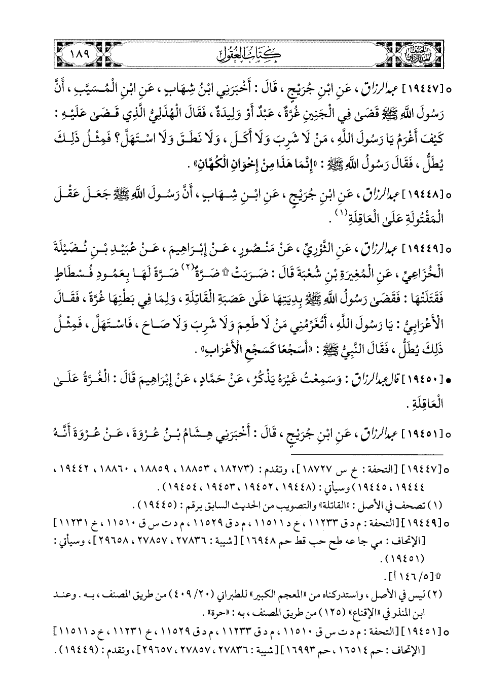 19448- عبد الرزاق، عَنِ ابْنِ جُرَيْجٍ، عَنِ ابْنِ شِهَابٍ، أَنَّ رَسُولَ اللهِ صَلَّى اللهُ عَلَيْهِ وَسَلَّمَ جَعَلَ عَقْلَ المَقْتُولَةِ عَلَى الْعَاقِلَةِ.
