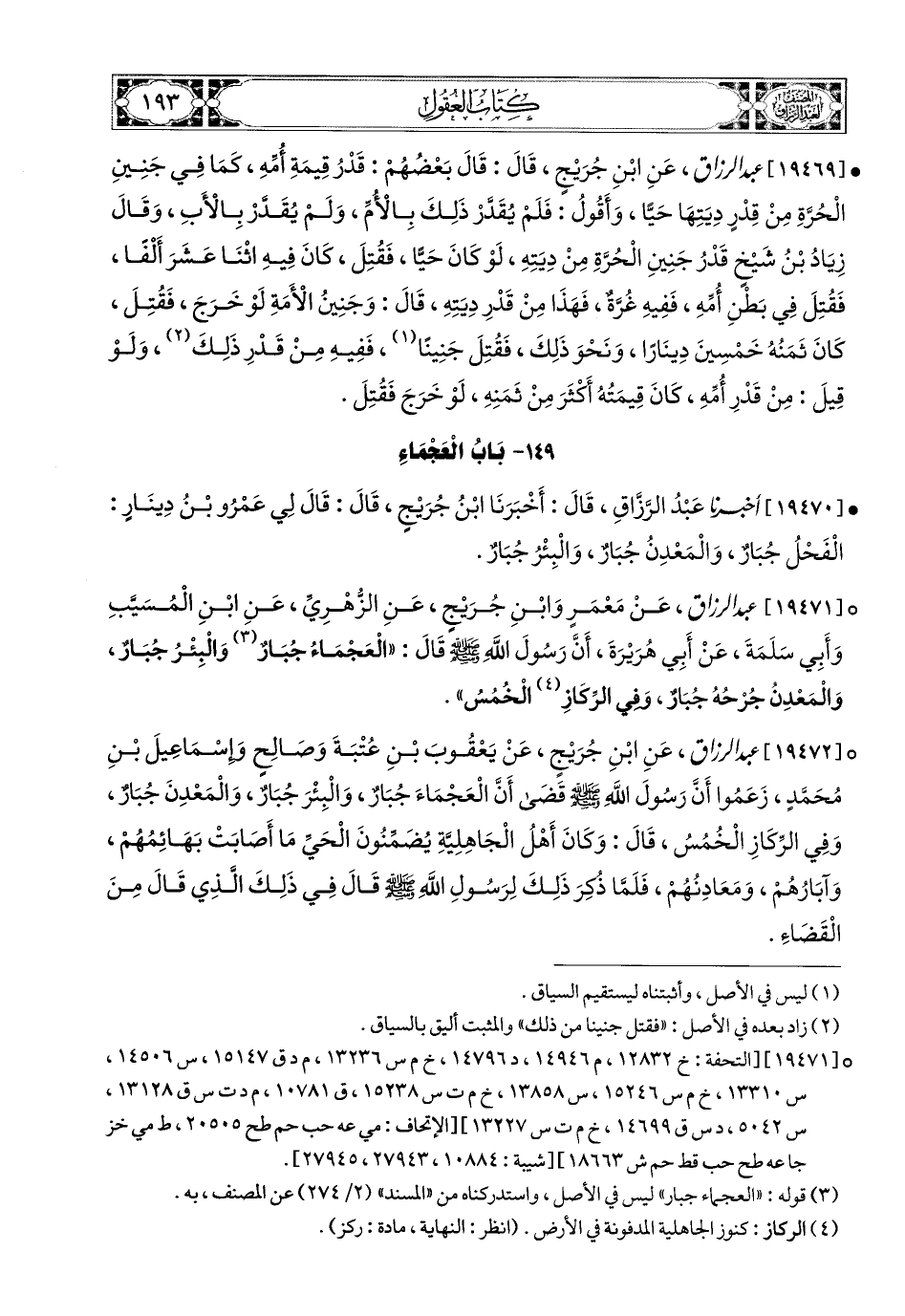 19471- عبد الرزاق، عَنْ مَعْمَرٍ، وَابْنِ جُرَيْجٍ، عَنِ الزُّهْرِيِّ، عَنِ ابْنِ المُسَيَّبِ، وَأَبِي سَلَمَةَ، عَنْ أَبِي هُرَيرَةَ، أَنَّ رَسُولَ اللهِ صَلَّى اللهُ عَلَيْهِ وَسَلَّمَ قَالَ: الْعَجْمَاءُ جُبَارٌ، وَالْبِئْرُ جُبَارٌ، وَالمَعْدِنُ جُرْحُهُ جُبَارٌ، وَفِي الرِّكَازِ الْخُمُسُ.
