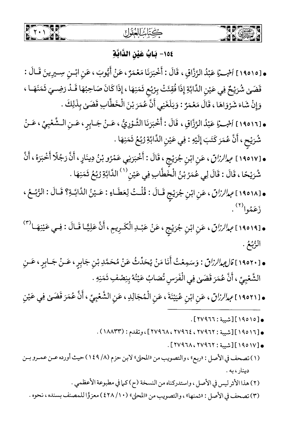 19517- عبد الرزاق، عَنِ ابْنِ جُرَيْجٍ، قَالَ: أَخْبَرَنِي عَمْرُو بن دِينَارٍ، أَنَّ رَجُلاً أَخْبَرَهُ، أَنَّ شُرَيْحًا قَالَ: قَالَ لِي عُمَرُ بن الْخَطَّابِ: فِي عَيْنِ الدَّابَّةِ رُبْعُ ثَمَنِهَا.