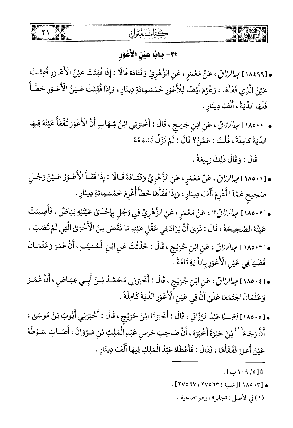 18505- أخبرنا عبد الرزاق، قَالَ: أَخْبَرَنَا ابْنُ جُرَيْجٍ، قَالَ: أَخْبَرَنِي أَيُّوبُ بن مُوسَى، أَنَّ رَجَاءَ بن حَيْوَةَ أَخْبَرَهُ، أَنَّ صَاحِبَ حَرَسِ عَبدِ المَلِكِ بْنِ مَرْوَانَ أَصَابَ سَوْطُهُ عَيْنَ أَعْوَرَ فَفَقَأَهَا، فَقَالَ: فَأَعْطَاهُ عَبدُ المَلِكِ فِيهَا أَلْفَ دِينَارٍ.