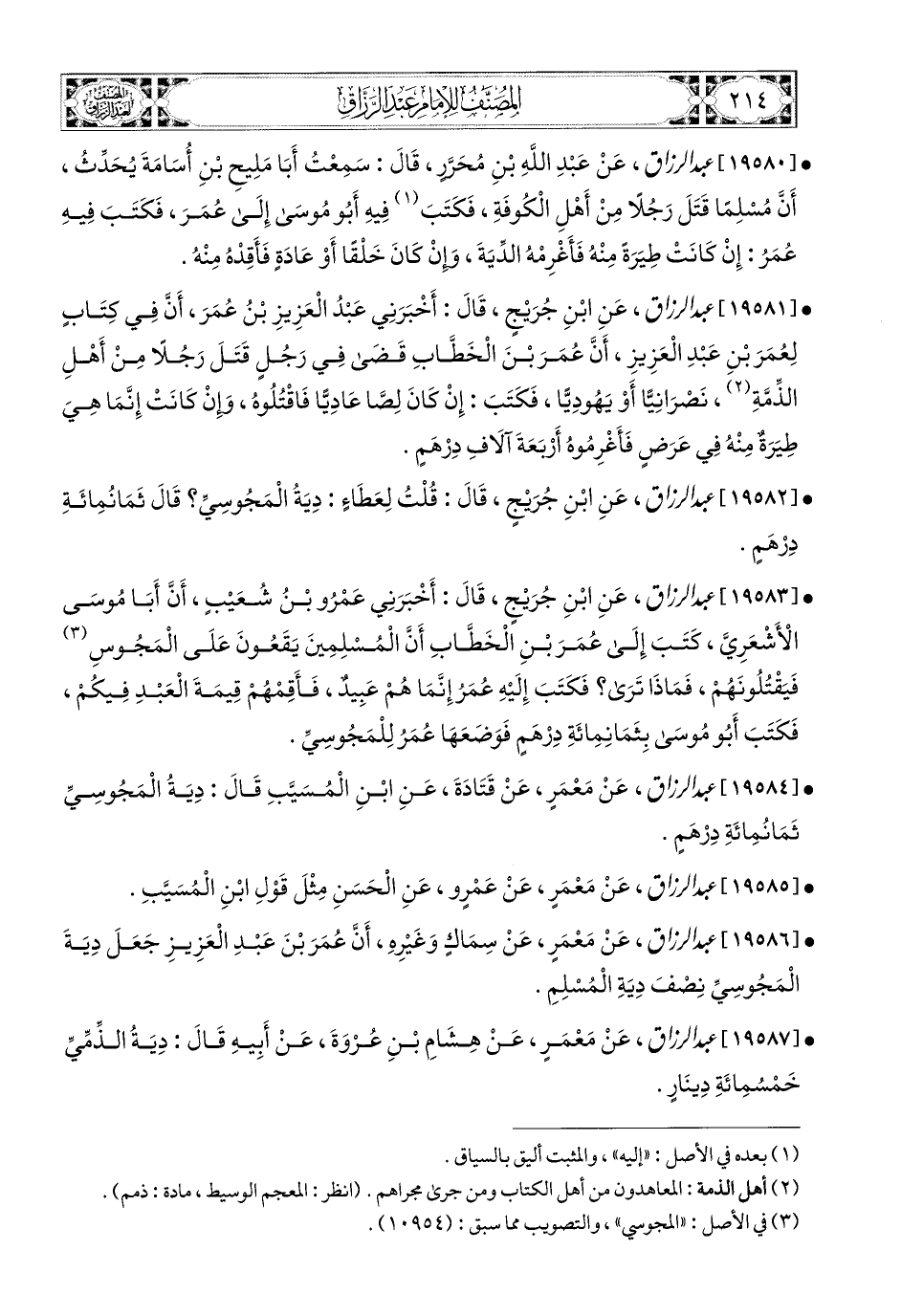 19586- عبد الرزاق، عَنْ مَعْمَرٍ، عَن سِمَاكٍ، وَغَيْرِهِ، أَنَّ عُمَرَ بن عَبدِ الْعَزِيزِ جَعَلَ دِيَةَ المَجُوسِيِّ نِصْفَ دِيَةِ المُسْلِمِ.