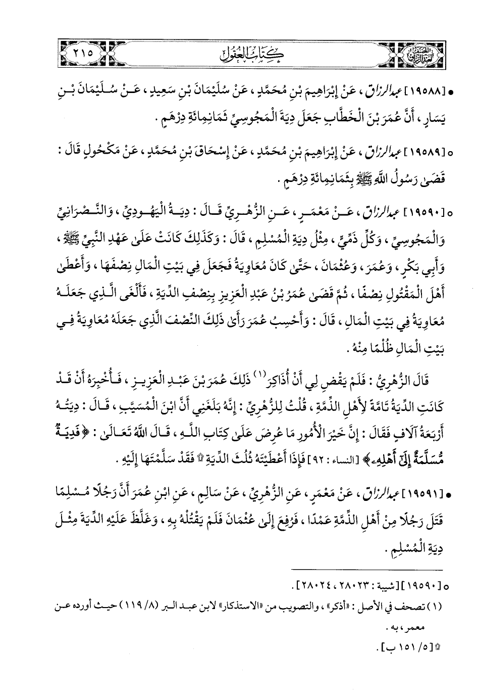 19590 - عبد الرزاق، عَنْ مَعْمَرٍ، عَنِ الزُّهْرِيِّ، قَالَ: دِيَةُ الْيَهُودِيِّ وَالنَّصْرَانِيِّ وَالمَجُوسِيِّ وَكُلِّ ذِمِّيٍّ مِثْلُ دِيَةِ المُسْلِمِ، قَالَ: وَكَذَلِكَ كَانَتْ عَلَى عَهْدِ النَّبِيِّ صَلَّى اللهُ عَلَيْهِ وَسَلَّمَ، وَأَبِي بَكْرٍ، وَعُمَرَ، وَعُثْمَانَ، حَتَّى كَانَ مُعَاوِيَةُ، فَجَعَلَ فِي بَيْتِ المَالِ نِصْفَهَا، وَأَعْطَى أَهْلَ المَقْتُولِ نِصْفًا، ثُمَّ قَضَى عُمَرُ بن عَبدِ الْعَزِيزِ بِنِصْفِ الدِّيَةِ، فَأَلْغَى الَّذِي جَعَلَهُ مُعَاوِيَةُ فِي بَيْتِ المَالِ، قَالَ: وَأَحْسَبُ عُمَرَ رَأَى ذَلِكَ النِّصْفَ الَّذِي جَعَلَهُ مُعَاوِيَةُ فِي بَيْتِ المَالِ ظُلْمًا مِنْهُ.