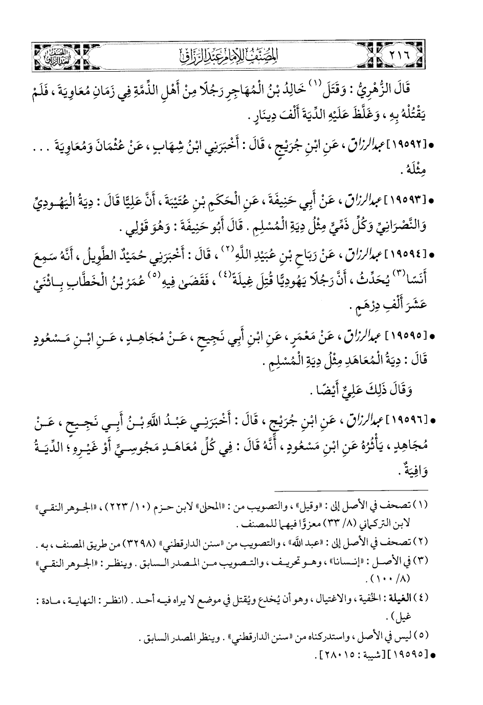 19595- عبد الرزاق، عَنْ مَعْمَرٍ، عَنِ ابْنِ أَبِي نَجِيحٍ، عَن مُجاهِدٍ، عَنِ ابْنِ مَسْعُودٍ، قَالَ: دِيَةُ المُعَاهَدِ مِثْلُ دِيَةِ المُسْلِمِ، وَقَالَ ذَلِكَ عَلِيٌّ أَيْضًا.