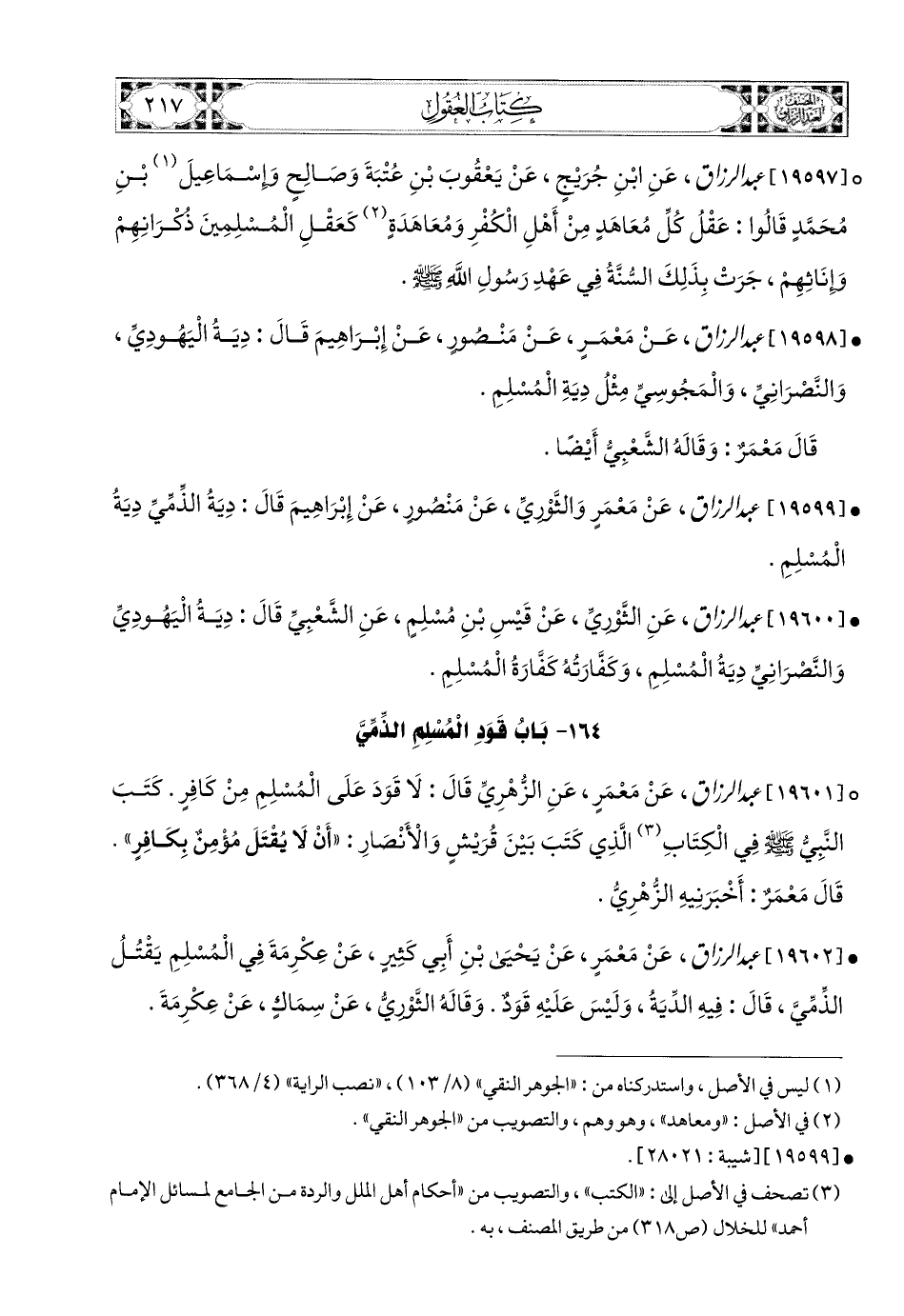 19601 - عبد الرزاق، عَنْ مَعْمَرٍ، عَنِ الزُّهْرِيِّ، قَالَ: لاَ قَوَدَ عَلَى المُسْلِمِ مِنْ كَافِرٍ، كَتَبَ النَّبِيُّ صَلَّى اللهُ عَلَيْهِ وَسَلَّمَ فِي الْكِتَابِ الَّذِي كَتَبَ بَيْنَ قُرَيْشٍ وَالأَنْصَارِ: أَنْ لاَ يُقْتَلَ مُؤْمِنٌ بِكَافِرٍ.