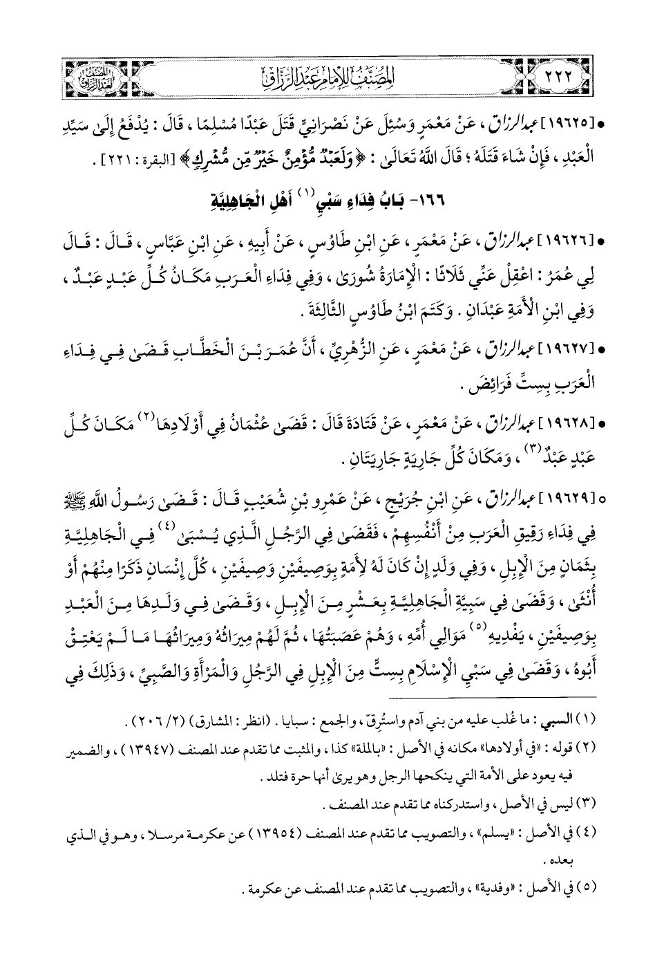 19627- عبد الرزاق، عَنْ مَعْمَرٍ، عَنِ الزُّهْرِيِّ، أَنَّ عُمَرَ بن الْخَطَّابِ قَضَى فِي فِدَاءِ الْعَرَبِ بِسِتِّ فَرَائِضَ.