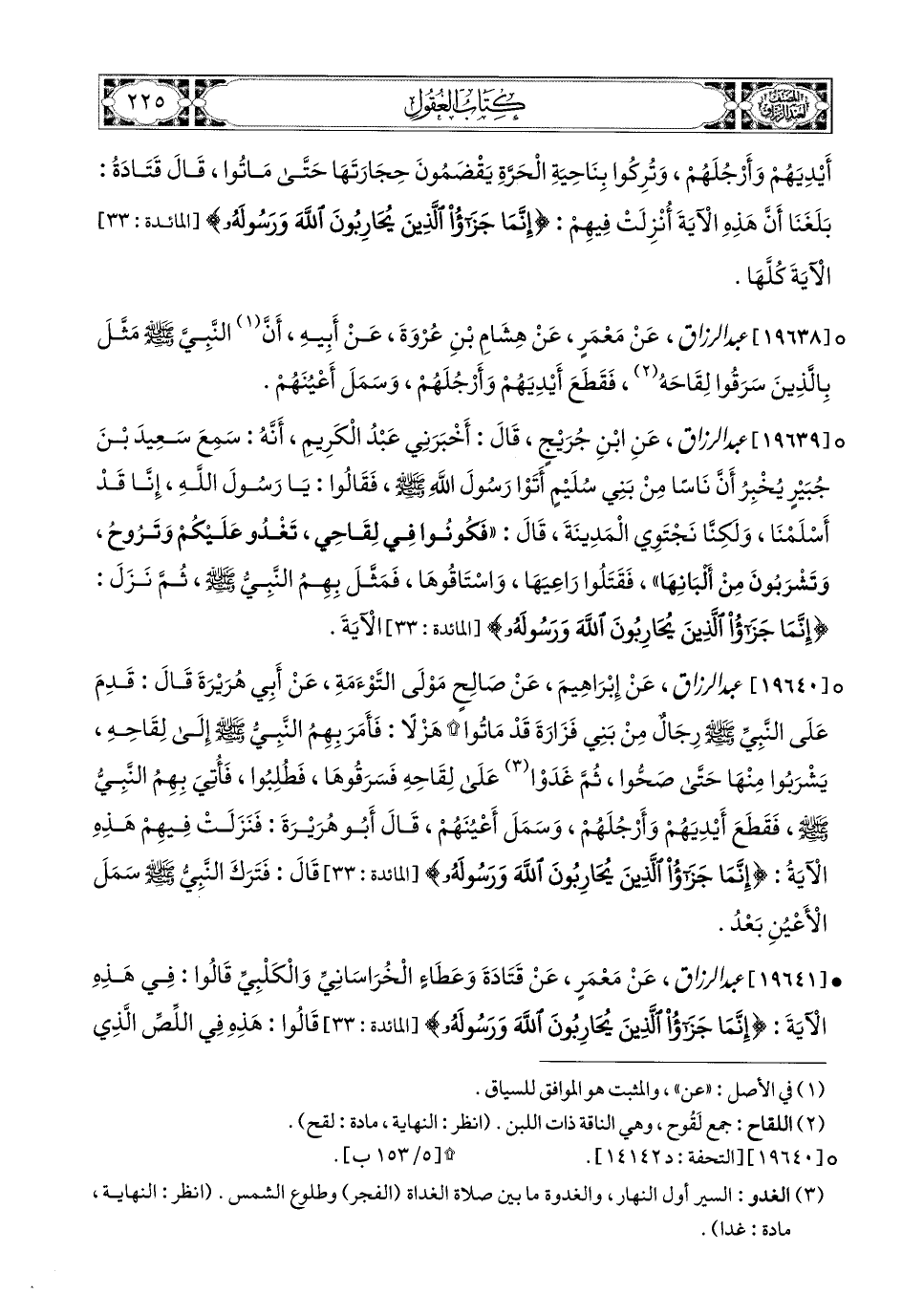 19639- عبد الرزاق، عَنِ ابْنِ جُرَيْجٍ، قَالَ: أَخْبَرَنِي عَبدُ الْكَرِيمِ، أَنَّهُ سَمِعَ سَعيدَ بن جُبَيرٍ يُخْبِرُ، أَنَّ نَاسًا مِنْ بَنِي سُلَيْمٍ أَتَوْا رَسُولَ اللهِ صَلَّى اللهُ عَلَيْهِ وَسَلَّمَ فَقَالُوا: يَا رَسُولَ اللهِ، إِنَّا قَدْ أَسْلَمْنَا، وَلَكِنَّا نَجْتَوِي المَدِينَةَ، قَالَ: فَكُونُوا فِي لِقَاحِي، تَغْدُو عَلَيْكُمْ، وَتَرُوحُ، وَتَشْرَبُونَ مِنْ أَلْبَانِهَا، فَقَتَلُوا رَاعِيَهَا، وَاسْتَاقُوهَا، فَمَثَّلَ بِهِمُ النَّبِيُّ صَلَّى اللهُ عَلَيْهِ وَسَلَّمَ، ثُمَّ نَزَلَ: {إِنَّمَا جَزَاءُ الَّذِينَ يُحَارِبُونَ اللهَ وَرَسُولَهُ} الآيَةَ.