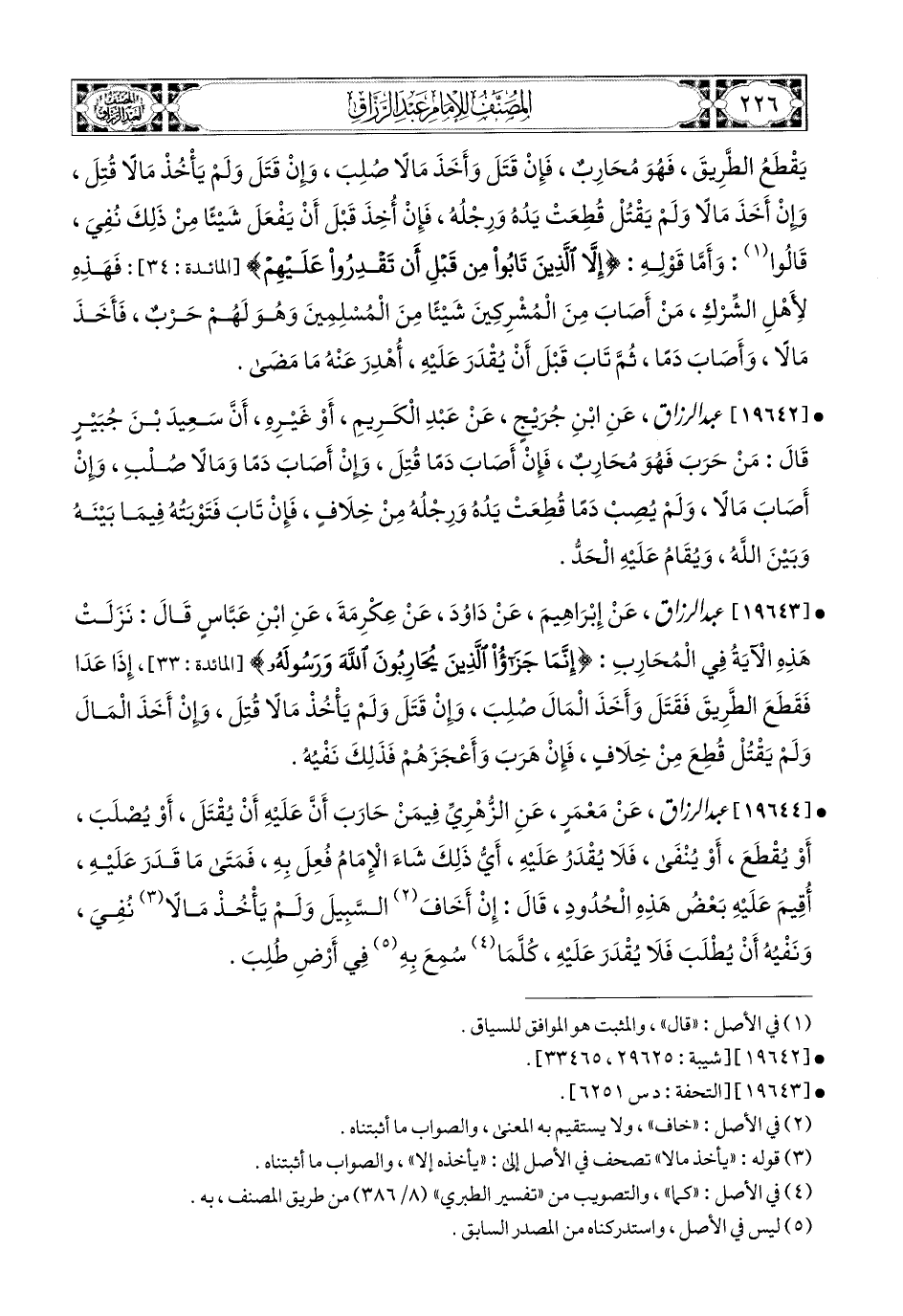 19643- عبد الرزاق، عَن إِبرَاهِيمَ، عَن دَاوُدَ، عَنْ عِكْرِمَةَ، عَنِ ابْنِ عَبَّاسٍ، قَالَ: نَزَلَتْ هَذِهِ الآيَةُ فِي المُحَارِبِ: {إِنَّمَا جَزَاءُ الَّذِينَ يُحَارِبُونَ اللهَ وَرَسُولَهُ} إِذَا عَدَا فَقَطَعَ الطَّرِيقَ فَقَتَلَ، وَأَخَذَ المَالَ صُلِبَ، وَإِنْ قَتَلَ وَلَمْ يَأْخُذْ مَالاً قُتِلَ، وَإِنْ أَخَذَ المَالَ وَلَمْ يَقْتُلْ، قُطِعَ مِنْ خِلاَفٍ، فَإِنْ هَرَبَ وَأَعْجَزَهَمْ فَذَلِكَ نَفْيُهُ.