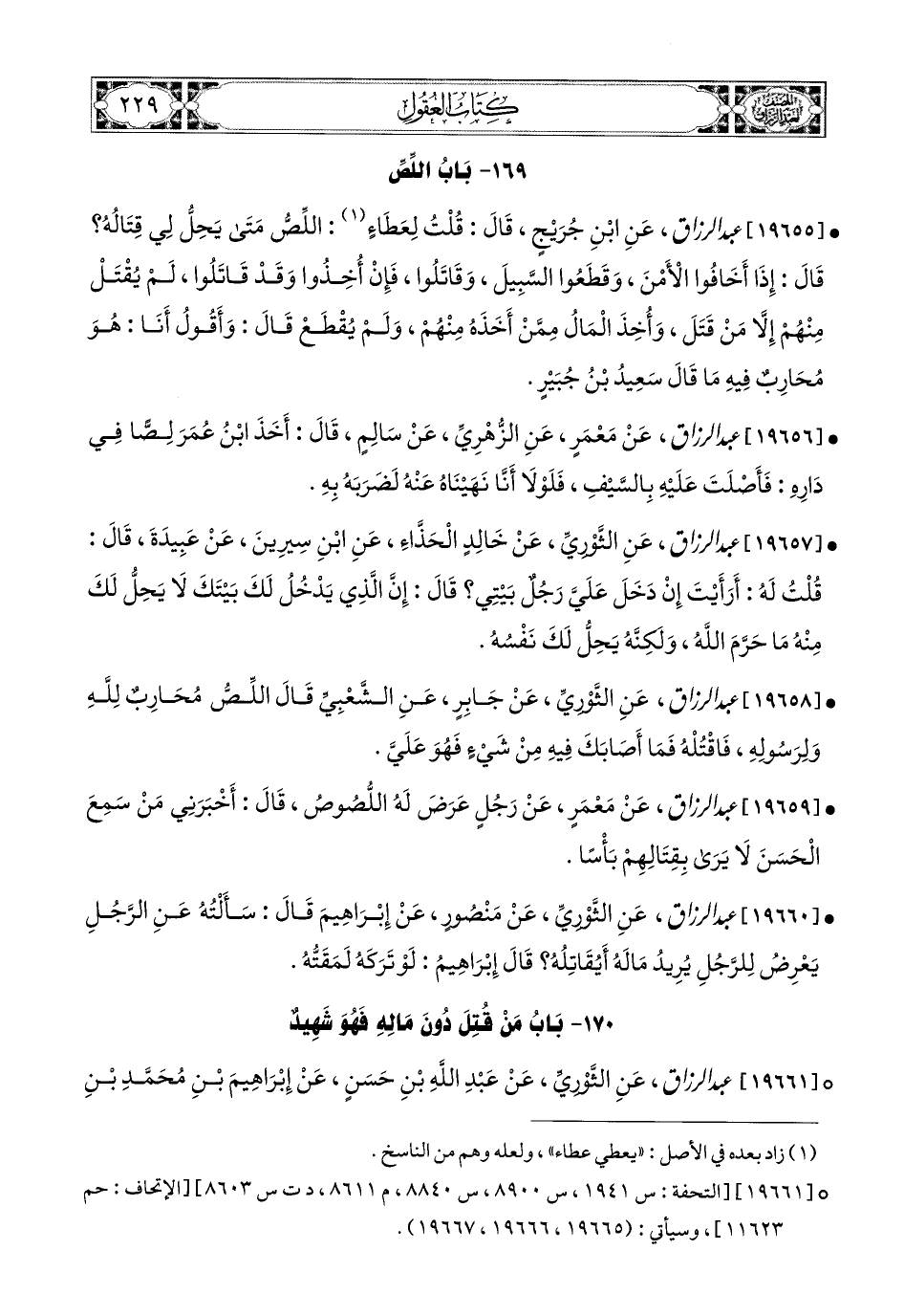 19655- عبد الرزاق، عَنِ ابْنِ جُرَيْجٍ، قَالَ: قُلْتُ لِعَطَاءٍ: اللِّصُّ مَتَى يَحِلُّ لِي قِتَالُهُ؟ قَالَ: إِذَا أَخَافُوا الأَمْنَ، وَقَطَعُوا السَّبِيلَ، وَقَاتَلُوا، فَإِنْ أُخِذُوا وَقَدْ قَاتَلُوا، لَمْ يُقْتَلْ مِنْهُمْ إِلاَّ مَنْ قَتَلَ، وَأُخِذَ المَالُ مِمَّنْ أَخَذَهُ مِنْهُمْ، وَلَمْ يُقْطَعْ، قَالَ: وَأَقُولُ أَنَا: هُوَ مُحَارِبٌ فِيهِ مَا قَالَ سَعيدُ بن جُبَيرٍ.