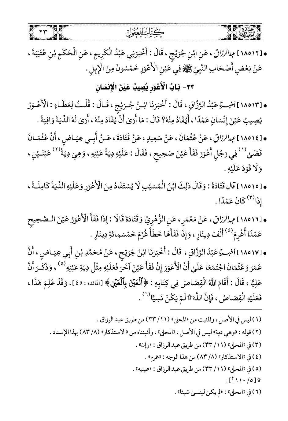 18513- أخبرنا عبد الرزاق، قَالَ: أَخْبَرَنَا ابْنُ جُرَيْجٍ، قَالَ: قُلْتُ لِعَطَاءٍ: الأَعْوَرُ يُصِيبُ عَيْنَ إِنْسَانٍ عَمْدًا، أَيُقَادُ مِنْهُ؟ قَالَ: مَا أَرَى أَنْ يُقَادَ مِنْهُ، أَرَى لَهُ الدِّيَةَ وَافِيَةً.