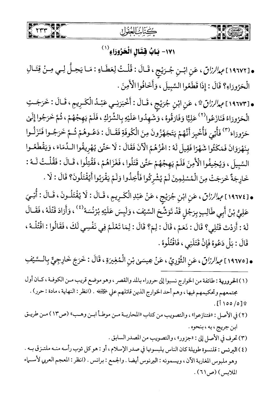 19672- عبد الرزاق، عَنِ ابْنِ جُرَيْجٍ، قَالَ: قُلْتُ لِعَطَاءٍ: مَا يَحِلُّ لِي مِنْ قِتَالِ الْحَرُوراء قَالَ: إِذَا قَطَعُوا السَّبِيلَ، وَأَخَافُوا الأَمِنَ.