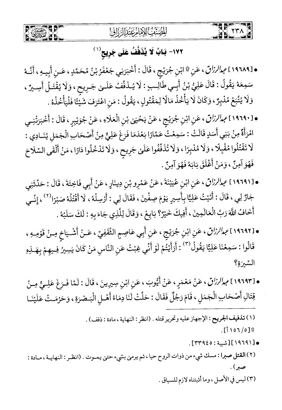 19689- عبد الرزاق، عَنِ ابْنِ جُرَيْجٍ، قَالَ: أَخْبَرَنِي جَعْفَرُ بن مُحَمَّدٍ، عَنْ أَبِيهِ، أَنَّهُ سَمِعَهُ يَقُولُ: قَالَ عَلِيُّ بن أَبِي طَالِبٍ: لاَ يُذَفَّفُ عَلَى جَرِيحٍ، وَلاَ يُقْتَلُ أَسِيرٌ، وَلاَ يُتَّبَعُ مُدْبِرٌ، وَكَانَ لاَ يَأْخُذُ مَالاً لِمَقْتُولٍ، يَقُولُ: مَنِ اعْتَرَفَ شَيْئًا فَلْيَأْخُذْهُ.