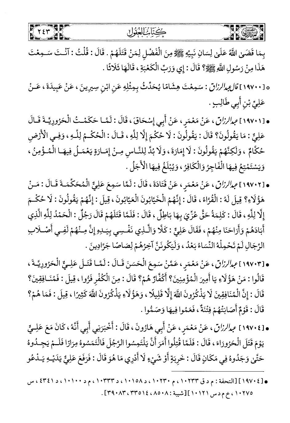 19702- عبد الرزاق، عَنْ مَعْمَرٍ، عَن قَتَادَةَ، قَالَ: لَمَّا سَمِعَ عَلِيٌّ المُحَكِّمَةَ قَالَ: مَنْ هَؤُلاَءِ؟ قِيلَ لَهُ: الْقُرَّاءُ، قَالَ: إِنَّهُمُ الْخَيَّابُونَ الْعَيَّابُونَ، قِيلَ: إِنَّهُمْ يَقُولُونَ: لاَ حُكْمَ إِلاَّ للهِ، قَالَ: كَلِمَةُ حَقٍّ عُزِّيَ بِهَا بَاطِلٌ، قَالَ: فَلَمَّا قَتَلَهُمْ، قَالَ رَجُلٌ: الْحَمْدُ للهِ الَّذِي أَبَادَهُمْ وَأَرَاحَنَا مِنْهُمْ، فَقَالَ عَلِيٌّ: كَلاَّ وَالَّذِي نَفْسِي بِيَدِهِ، إِنَّ مِنْهُمْ لَفِي أَصْلاَبِ الرِّجَالِ، لَمْ تَحْمِلْهُ النِّسَاءُ بَعْدُ، وَلَيَكُونُنَّ آخِرُهُمْ لصَاصًا (1) جَرَّادِينَ.