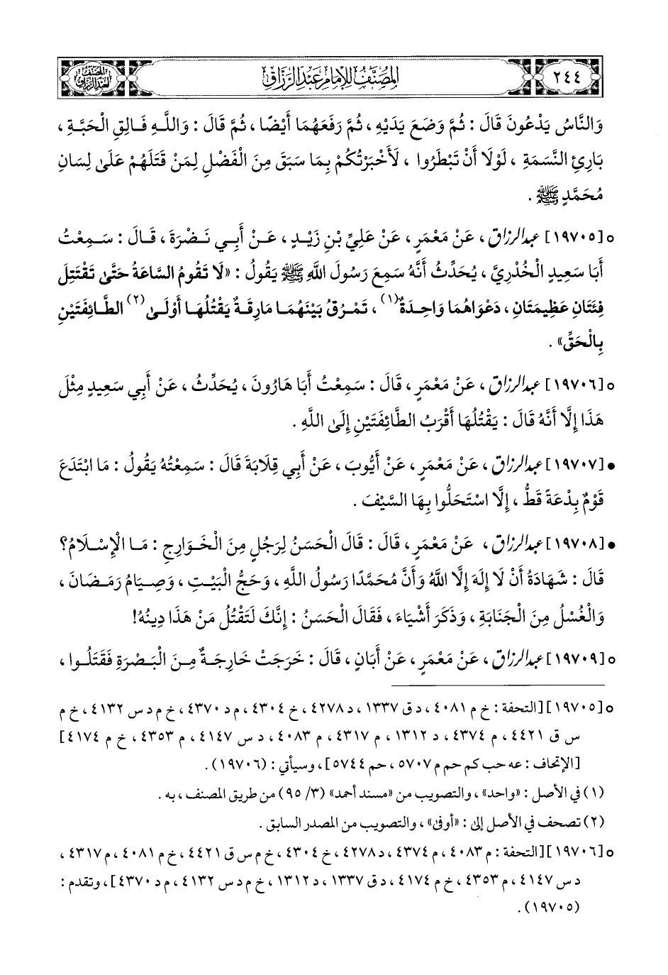 19705- عبد الرزاق، عَنْ مَعْمَرٍ، عَنْ عَلِيِّ بْنِ زَيْدٍ، عَنْ أَبِي نَضْرَةَ، قَالَ: سَمِعْتُ أَبَا سَعيدٍ الْخُدْرِيَّ يُحَدِّثُ، أَنَّهُ سَمِعَ رَسُولَ اللهِ صَلَّى اللهُ عَلَيْهِ وَسَلَّمَ يَقُولُ: لاَ تَقُومُ السَّاعَةُ حَتَّى تَقْتَتِلَ فِئَتَانِ عَظِيمَتَانِ، دَعْوَاهُمَا وَاحِدَةٌ، تَمْرُقُ بَيْنَهُمَا مَارِقَةٌ يَقْتُلُهَا أَوْلَى الطَّائِفَتَيْنِ بِالْحَقِّ.