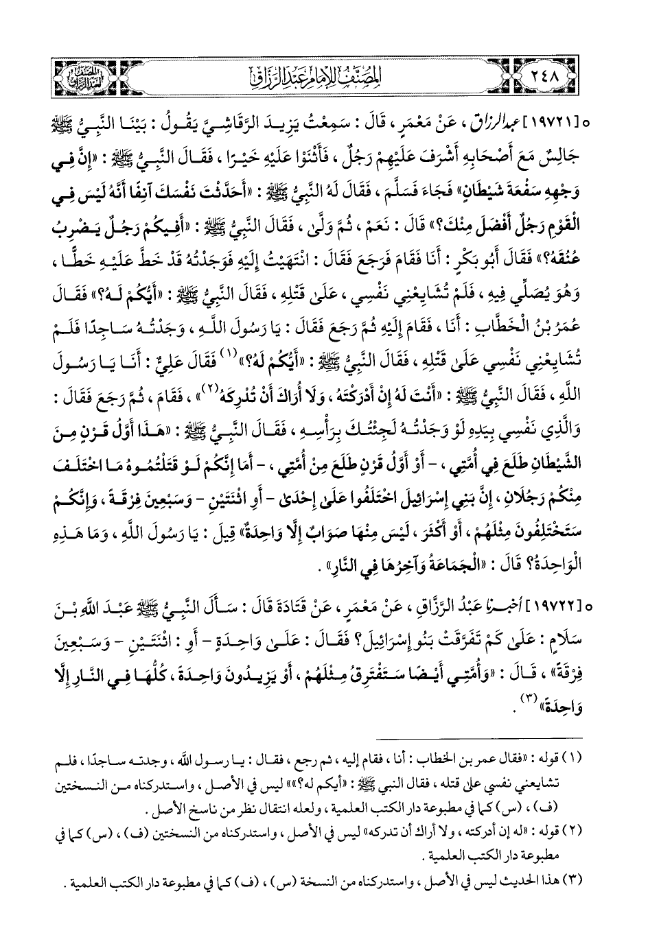 19721- عبد الرزاق، عَنْ مَعْمَرٍ، قَالَ: سَمِعْتُ يَزِيدَ الرَّقَاشِيَّ، يَقُولُ: بَيْنَا النَّبِيُّ صَلَّى اللهُ عَلَيْهِ وَسَلَّمَ جَالِسٌ مَعَ أَصْحَابِهِ، أَشْرَفَ عَلَيْهِمْ رَجُلٌ، فَأَثْنَوْا عَلَيْهِ خَيْرًا، فَقَالَ النَّبِيُّ صَلَّى اللهُ عَلَيْهِ وَسَلَّمَ: إِنَّ فِي وَجْهِهِ سَفْعَةَ شَيْطَانٍ، فَجَاءَ، فَسَلَّمَ، فَقَالَ لَهُ النَّبِيُّ صَلَّى اللهُ عَلَيْهِ وَسَلَّمَ: أَحَدَّثْتَ نَفْسَكَ آنِفًا أَنَّهُ لَيْسَ فِي الْقَوْمِ رَجُلٌ أَفْضَلَ مِنْكَ؟ قَالَ: نَعَمْ، ثُمَّ وَلَّى، فَقَالَ النَّبِيُّ صَلَّى اللهُ عَلَيْهِ وَسَلَّمَ: أَفِيكُمْ رَجُلٌ يَضْرِبُ عُنُقَهُ؟ فَقَالَ أَبو بَكْرٍ: أَنَا، فَقَامَ، فَرَجَعَ، فَقَالَ: انْتَهَيْتُ إِلَيْهِ، فَوَجَدْتُهُ قَدْ خَطَّ عَلَيْهِ خَطًّا، وَهُوَ يُصَلِّي فِيهِ، فَلَمْ تُشَايِعْنِي نَفْسِي عَلَى قَتْلِهِ، فَقَالَ النَّبِيُّ صَلَّى اللهُ عَلَيْهِ وَسَلَّمَ: أَيُّكُمْ لَهُ؟ فَقَالَ عُمَرُ بن الْخَطَّابِ: أَنَا، فَقَامَ إِلَيْهِ، ثُمَّ رَجَعَ، فَقَالَ: يَا رَسُولَ اللهِ، وَجَدْتُهُ سَاجِدًا، فَلَمْ تُشَايِعْنِي نَفْسِي عَلَى قَتْلِهِ، فَقَالَ النَّبِيُّ صَلَّى اللهُ عَلَيْهِ وَسَلَّمَ: أَيُّكُمْ لَهُ؟ فَقَالَ عَلِيٌّ: أَنَا يَا رَسُولَ اللهِ، فَقَالَ النَّبِيُّ صَلَّى اللهُ عَلَيْهِ وَسَلَّمَ: أَنْتَ لَهُ إِنْ أَدْرَكْتَهُ، وَلاَ أُرَاكَ أَنْ تُدْرِكَهُ، فَقَامَ، ثُمَّ رَجَعَ، فَقَالَ: وَالَّذِي نَفْسِي بِيَدِهِ، لَوْ وَجَدْتُهُ لَجِئْتُكَ بِرَأْسِهِ، فَقَالَ النَّبِيُّ صَلَّى اللهُ عَلَيْهِ وَسَلَّمَ: هَذَا أَوَّلُ قَرْنٍ مِنَ الشَّيْطَانِ طَلَعَ فِي أُمَّتِي، أَوْ أَوَّلُ قَرْنٍ طَلَعَ مِنْ أُمَّتِي، أَمَا إِنَّكُمْ لَوْ قَتَلْتُمُوهُ مَا اخْتَلَفَ مِنْكُمْ رَجُلاَنِ، إِنَّ بَنِي إِسْرَائِيلَ اخْتَلَفُوا عَلَى إِحْدَى، أَوِ اثْنَتَيْنِ وَسَبْعِينَ فِرْقَةً، وَإِنَّكُمْ سَتَخْتَلِفُونَ مِثْلَهُمْ، أَوْ أَكْثَرَ، لَيْسَ مِنْهَا صَوَابٌ إِلاَّ وَاحِدَةٌ، قِيلَ: يَا رَسُولَ اللهِ، وَمَا هَذِهِ الْوَاحِدَةُ؟ قَالَ: الْجَمَاعَةُ، وَآخِرُهَا فِي النَّارِ.
