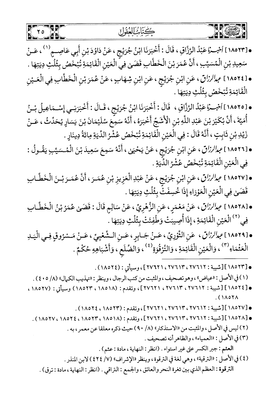 18523- أخبرنا عبد الرزاق، قَالَ: أَخْبَرَنَا ابْنُ جُرَيْجٍ، عَن دَاوُدَ بْنِ أَبِي عَاصِمٍ، عَن سَعيدِ بْنِ المُسَيَّبِ، أَنَّ عُمَرَ بن الْخَطَّابِ قَضَى فِي الْعَيْنِ الْقَائِمَةِ تُبْخَصُ بِثُلُثِ دِيَتِهَا.
