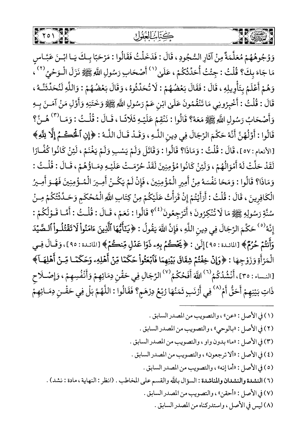 قَالَ: قُلْتُ: وَمَا هُنَّ؟ قَالُوا: أَوَّلُهُنَّ؛ أَنَّهُ حَكَّمَ الرِّجَالَ فِي دِينِ اللهِ، وَقَدْ قَالَ اللهُ: {إِنِ الْحُكْمُ إِلاَّ للهِ} قَالَ: قُلْتُ: وَمَاذَا؟ قَالُوا: وَقَاتَلَ، وَلَمْ يَسْبِ، وَلَمْ يَغْنَمْ، لَئِنْ كَانُوا كُفَّارًا لَقَدْ حَلَّتْ لَهُ أَمْوَالُهُمْ، وَلَئِنْ كَانُوا مُؤْمِنِينَ لَقَدْ حُرِّمَتْ عَلَيْهِ دِمَاؤُهُمْ؟ قَالَ: قُلْتُ: وَمَاذَا؟ قَالُوا: وَمَحَا (1) نَفْسَهُ مِنْ أَمِيرِ المُؤْمِنِينِ، فَإِنْ لَمْ يَكُنْ أَمِيرَ المُؤْمِنِينَ، فَهُوَ أَمِيرُ الْكَافِرِينَ، قَالَ: قُلْتُ: أَرَأَيْتُمْ إِنْ قَرَأْتُ عَلَيْكُمْ مِنْ كِتَابِ اللهِ المُحْكَمِ، وَحَدَّثْتُكُمْ مِنْ سُنَّةِ نَبِيِّهِ (2) صَلَّى اللهُ عَلَيْهِ وَسَلَّمَ مَا لاَ تُنْكِرُونَ، أَتَرْجِعُونَ؟ قَالُوا: نَعَمْ، قَالَ: قُلْتُ: أَمَّا قَوْلُكُمْ: إِنَّهُ حَكَّمَ الرِّجَالَ فِي دِينِ اللهِ، فَإِنَّ اللهَ يَقُولُ: {يَا أَيُّهَا الَّذِينَ آمَنُوا لاَ تَقْتُلُوا الصَّيْدَ وَأَنْتُمْ حُرُمٌ} إِلَى: {يَحْكُمُ بِهِ ذَوَا عَدْلٍ مِنْكُمْ} وَقَالَ فِي المَرْأَةِ وَزَوْجِهَا: {وَإِنْ خِفْتُمْ شِقَاقَ بَيْنِهِمَا فَابْعَثُوا حَكَمًا مِنْ أَهْلِهِ وَحَكَمًا مِنْ أَهْلِهَا} أَنْشُدُكُمُ اللهَ، أَفَحُكْمُ الرِّجَالِ فِي حَقْنِ دِمَائِهِمْ وَأَنْفُسِهِمْ، وَإِصْلاَحِ ذَاتِ بَيْنِهِمْ أَحَقُّ، أَمْ فِي أَرْنَبٍ ثَمَنُهَا رُبْعُ دِرْهَمٍ؟ فَقَالُوا (3): اللهُمَّ بَلْ فِي حَقْنِ دِمَائِهِمْ، وَإِصْلاَحِ ذَاتِ بَيْنِهِمْ، قَالَ: أَخَرَجْتُ مِنْ هَذِهِ؟ قَالُوا: اللهُمَّ نَعَمْ،