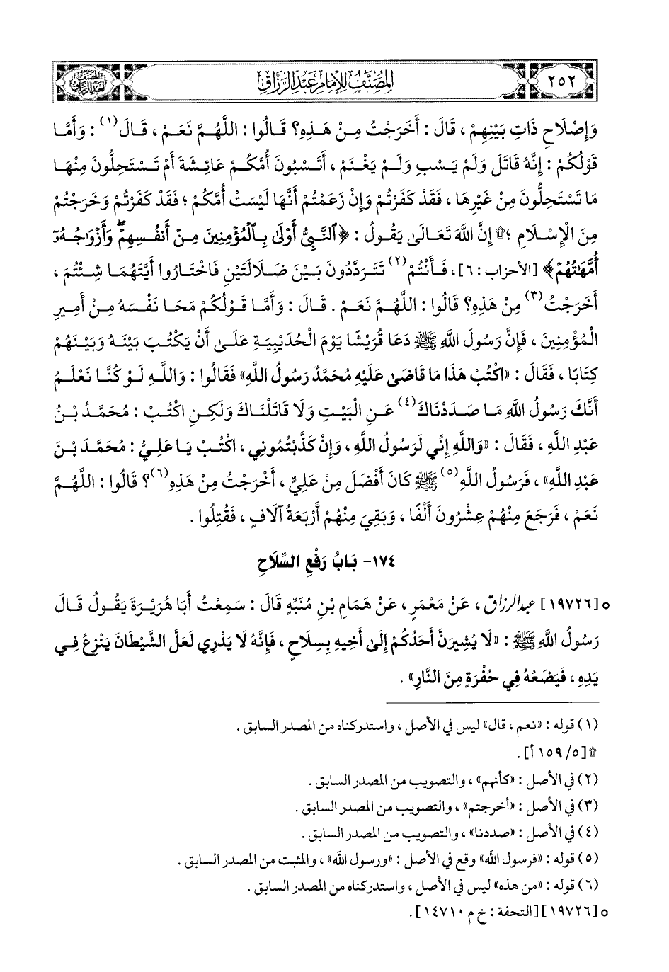 19726- عبد الرزاق، عَنْ مَعْمَرٍ، عَن هَمَّامِ بْنِ مُنَبِّهٍ، قَالَ: سَمِعْتُ أَبَا هُرَيرَةَ يَقُولُ: قَالَ رَسُولُ اللهِ صَلَّى اللهُ عَلَيْهِ وَسَلَّمَ: لاَ يُشِيرَنَّ أَحَدُكُمْ إَلَى (1) أَخِيهِ بِسِلاَحٍ، فَإِنَّهُ لاَ يَدْرِي لَعَلَّ الشَّيْطَانَ يَنْزِعُ فِي يَدِهِ، فَيَضَعُهُ فِي حُفْرَةٍ مِنْ نَارٍ.