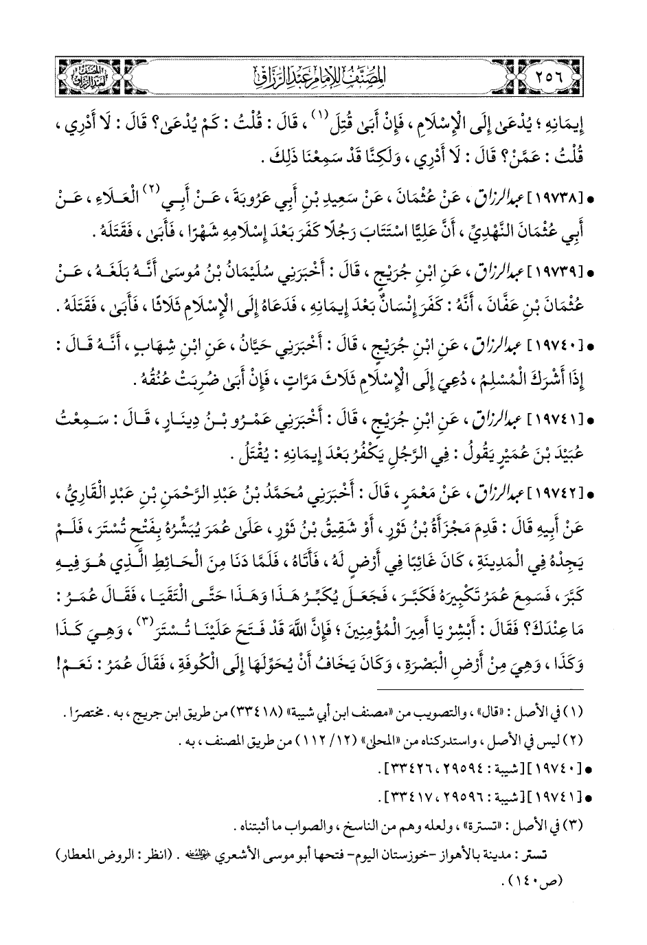 19742 - عبد الرزاق، عَنْ مَعْمَرٍ، قَالَ: أَخْبَرَنِي مُحَمَّدُ بن عَبدِ الرَّحْمَنِ بْنِ عَبدٍ الْقَارِيِّ، عَنْ أَبِيهِ، قَالَ: قَدِمَ مَجْزَأَةُ بن ثَوْرٍ، أَوْ شَقِيقُ بن ثَوْرٍ، عَلَى عُمَرَ يُبَشِّرُهُ بِفَتْحِ تُسْتَرَ، فَلَمْ يَجِدْهُ فِي المَدِينَةِ، كَانَ غَائِبًا فِي أَرْضٍ لَهُ، فَأَتَاهُ، فَلَمَّا دَنَا مِنَ الْحَائِطِ الَّذِي هُوَ فِيهِ كَبَّرَ، فَسَمِعَ عُمَرُ تَكْبِيرَهُ فَكَبَّرَ، فَجَعَلَ يُكَبِّرُ هَذَا وَهَذَا حَتَّى الْتَقَيَا، فَقَالَ عُمَرُ: مَا عِنْدَكَ؟ فَقَالَ: أَبْشِرْ يَا أَمِيرَ المُؤْمِنِينَ، فَإِنَّ (1) اللهَ قَدْ فَتَحَ عَلَيْنَا تُسْتَرَ، وَهِي كَذَا وَكَذَا، وَهِي مِنْ أَرْضِ الْبَصْرَةِ، وَكَانَ يَخَافُ أَنْ يُحَوِّلَهَا إِلَى الْكُوفَةِ، فَقَالَ [عُمَرُ]: (2) نَعَمْ، هِيَ مِنْ أَرْضِ الْبَصْرَةِ، هِيهْ، هَلْ كَانَتْ مَغْرَبَةٌ تُخْبِرنَاهَا؟ قَالَ: لاَ، إِلاَّ أَنَّ رَجُلاً مِنَ الْعَرَبِ ارْتَدَّ، فَضَرَبْنَا عُنُقَهُ، فَقَالَ (3) عُمَرُ: وَيْحَكُمْ، فَهَلاَّ طَيَّنْتُمْ عَلَيْهِ بَابًا، وَفَتَحْتُمْ لَهُ كَوَّةً، فَأَطْعَمْتُمُوهُ مِنْهَا كُلَّ يَوْمٍ رَغِيفًا، وَسَقَيْتُمُوهُ كُوزًا مِنْ مَاءٍ ثَلاَثَةَ أَيَّامٍ، ثُمَّ عَرَضْتُمْ عَلَيْهِ الإِسْلاَمَ فِي الْيَوْمِ الثَّالِثِ، فَلَعَلَّهُ أَنْ يُرَاجِعَ، ثُمَّ قَالَ: اللهُمَّ لَمْ أَحْضُرْ، وَلَمْ آمُرْ، وَلَمْ أَعْلَمْ.